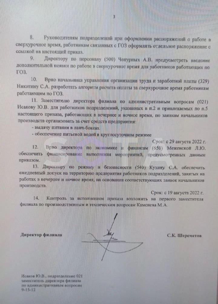 Руководство ульяновского авиапредприятия «Авиастар» (филиал ПАО «Ил», части «Объединенной авиастроительной корпорации») выпустило распоряжение, основанное на постановлении правительства от 1 августа 2022 года. Согласно ему, для выполнения оборонного заказа можно привлекать рабочих к сверхурочным работам: смены можно увеличивать на 4 дополнительных часа, рабочими днями могут становиться выходные и праздники, а отпуска — переноситься. Все это — без согласия рабочих.