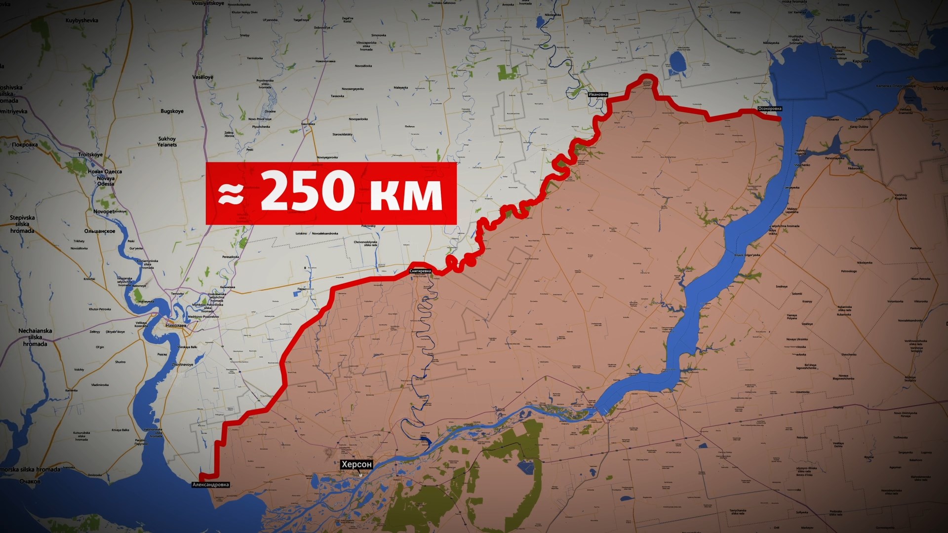 Линия фронта по правому берегу Днепра сейчас проходит следующим образом: северная часть – около 55 километров, это от села Осокоровка до села Ивановка; южнее – на 120 км линия извивается, как змея, повторяя русло реки Ингулец; возле Снегиревки оккупированные территории переходят на правый берег Ингульца, огибают Херсон и спускаются в населенный пункт Александровка.