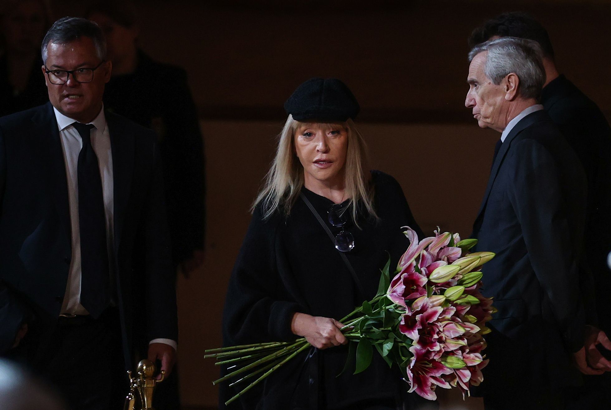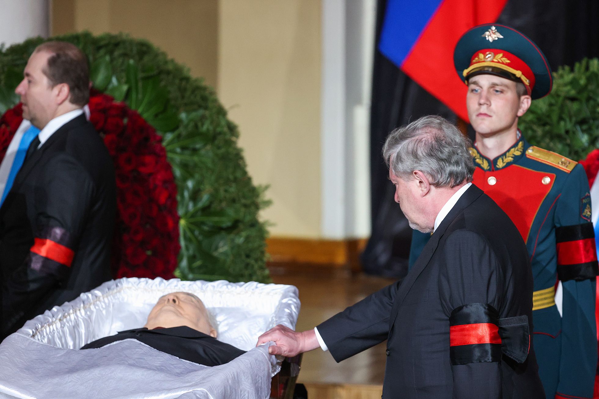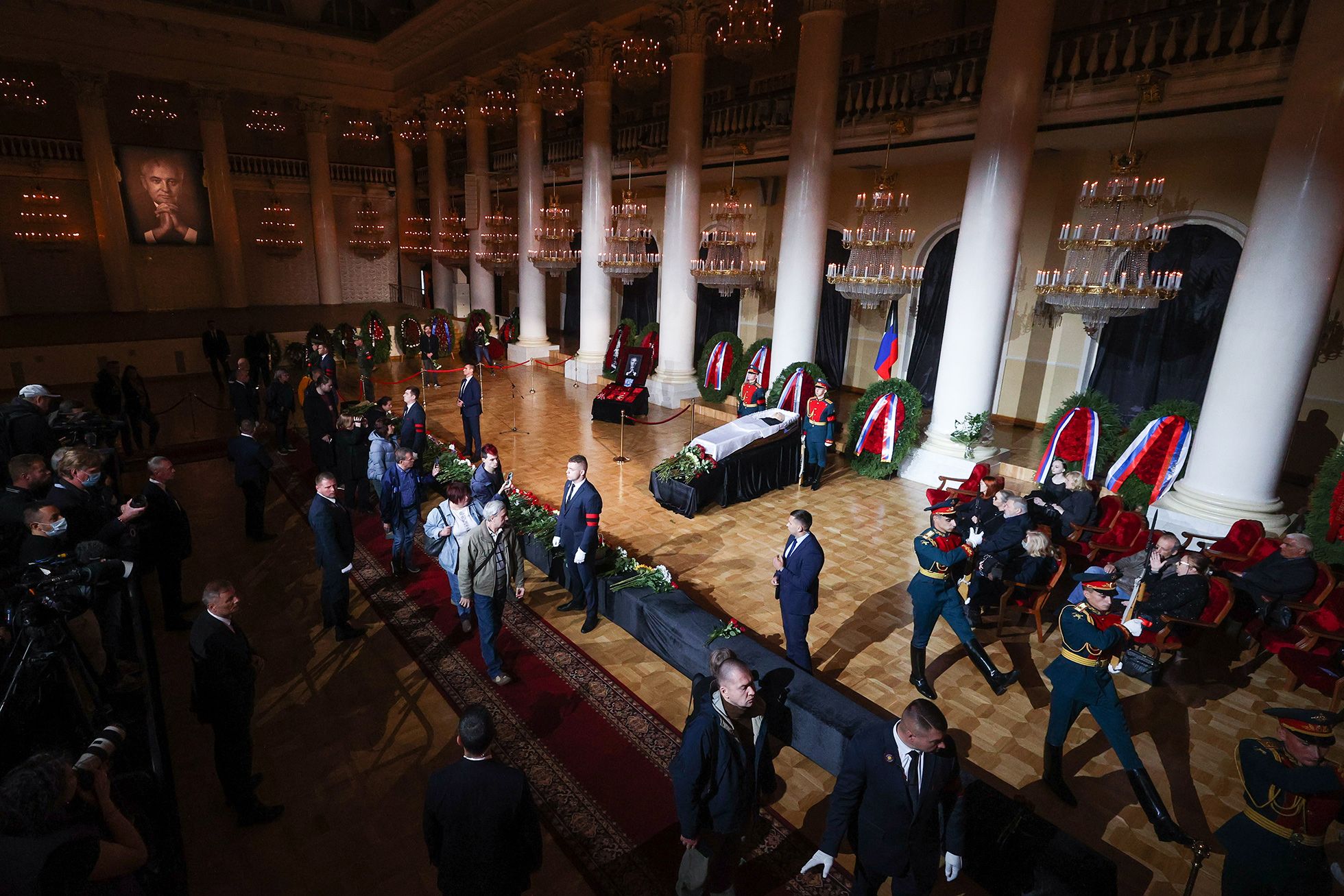 В зале играет классическая музыка. Гроб стоит в центре — в окружении почетного караула, отгороженный от проходящих мимо людей длинным низким постаментом, задрапированным черной тканью. На постамент складывают цветы. Цветов много. Подойти к гробу нельзя, постоять перед ним — тоже. Напротив покойного на высокой трибуне — много телевизионных камер. Справа от гроба на стульях сидят родственники и знакомые. Первых лиц не видно, Дмитрий Медведев уехал с прощания до того, как в зал пустили простых людей.