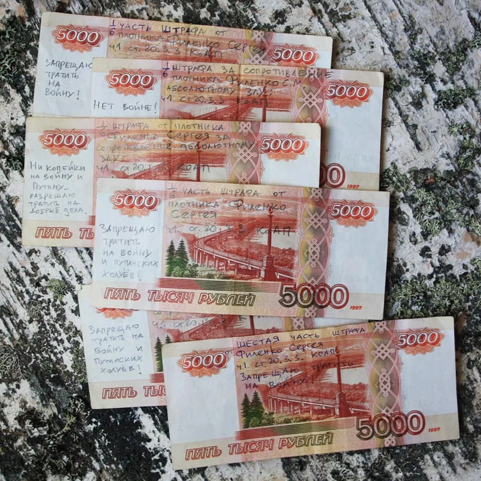 Sergey Filenko, a carpenter, writer and blogger from Russia’s Petrozavodsk, used bills marked with anti-war statements to pay out his fine for “discrediting” the Russian army, he wrote on Facebook.