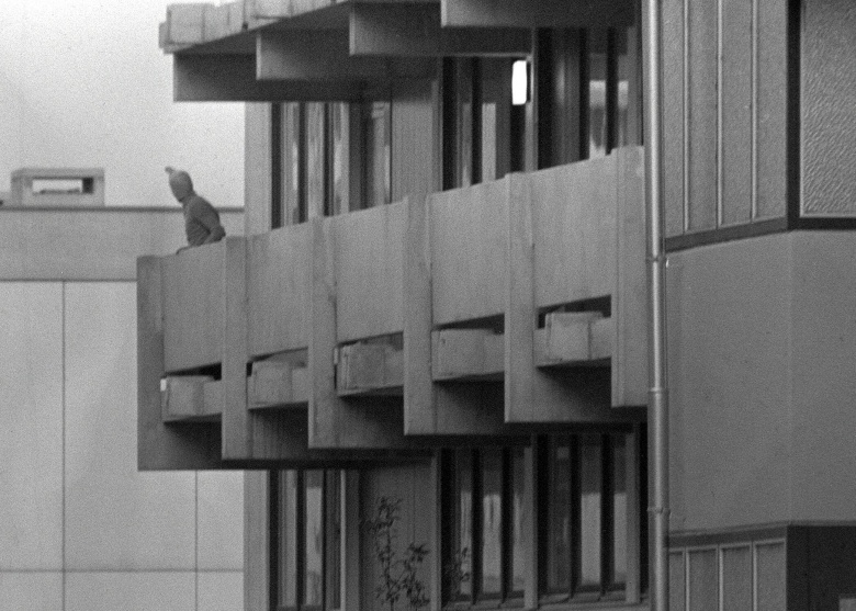 Палестинский террорист из организации «Черный сентябрь» на балконе здания с израильскими спортсменами-заложниками в Олимпийской деревне. Мюнхен, 5 сентября 1972 г.