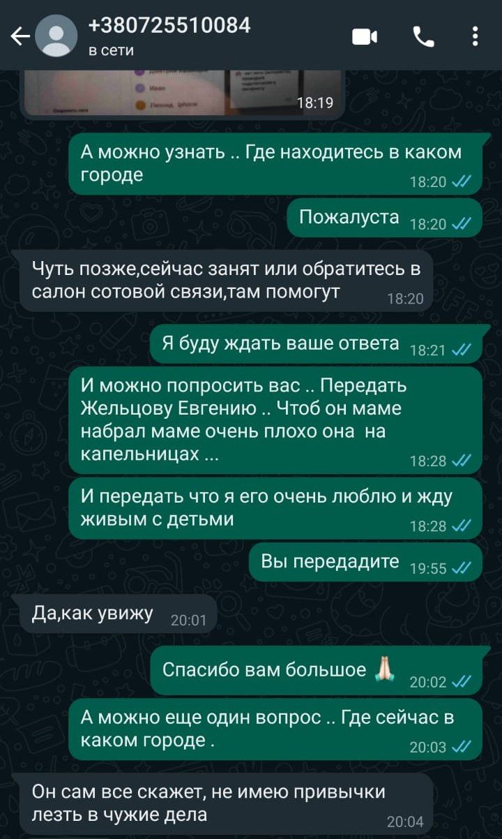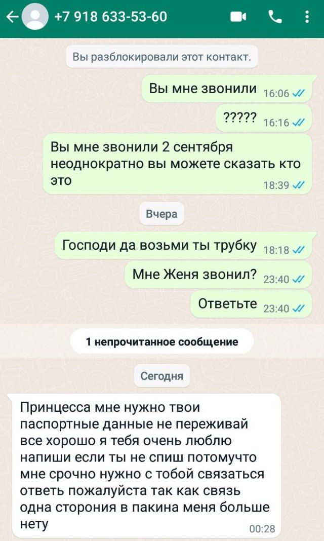 Спустя неделю Виктории Муравьевой позвонили с незнакомого номера. Он зарегистрирован в Краснодарском крае. Она не взяла трубку. Ночью с того же номера пришло сообщение в WhatsApp. «Я спросила: а ты вообще где сейчас, когда уехал? Он сказал, что не знает и ничего не помнит. Сказал что «едет строить города на Донбасс» и опять посоветовал не переживать, уверял, что всё хорошо. После этого мы с ним не связывались», – говорит супруга заключённого.