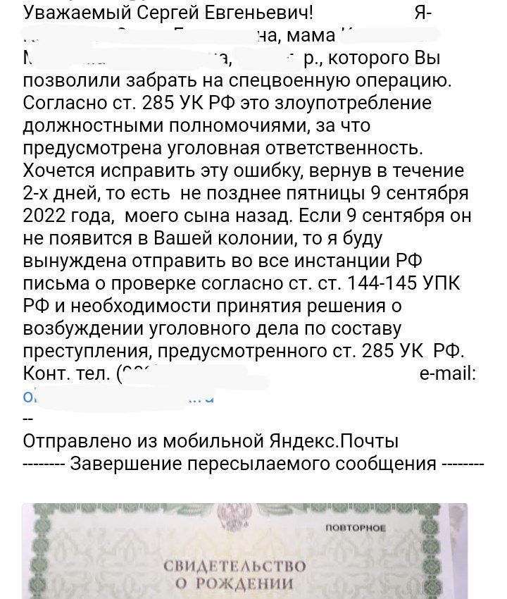 Мы подняли всё. Мы пишем жалобы во все инстанции, звоним, трясём. Но никаких ответов мы не получаем. Я не сложу руки. Мне нужен мой сын живым. Для чего издаются законы? Если по закону его нельзя брать, что он там забыл? Нельзя отправлять туда осуждённых, по закону»,