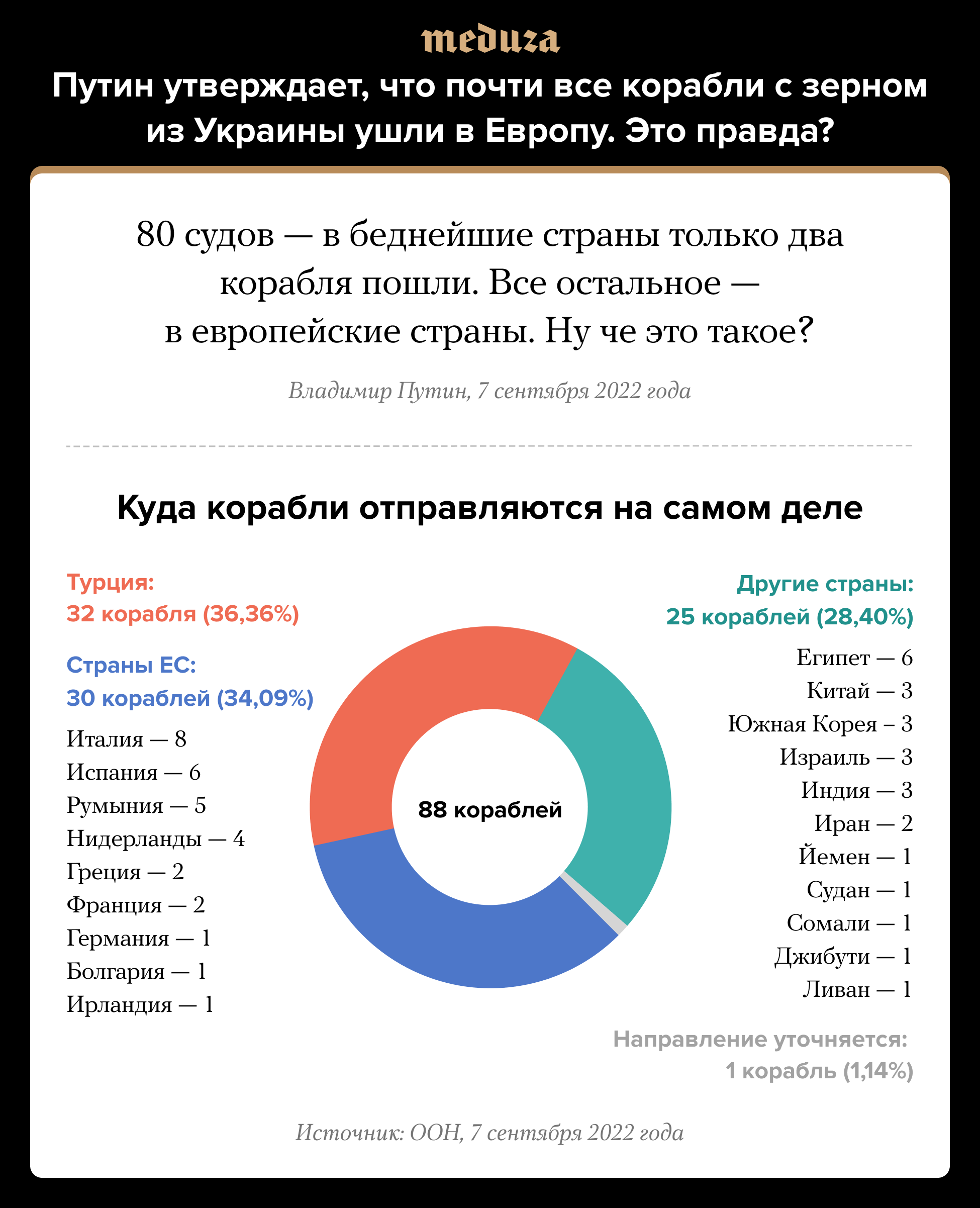 7 сентября во время выступления на Восточном экономическом форуме президент России Владимир Путин заявил, почти все зерно, вывезенное из Украины в рамках зерновой сделки, попало в Евросоюз, а не в беднейшие страны. Он допустил ограничение вывоза украинского зерна в ЕС.