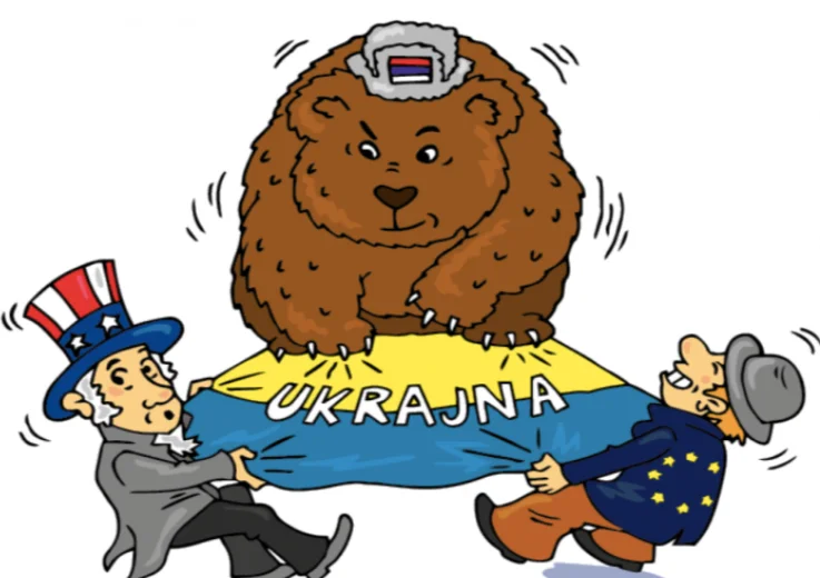 Помимо этого, в учебнике есть иллюстрация, где Россия изображена в образе медведя, а ЕС и США — как разрывающие украинский флаг мужчины в шляпах.
