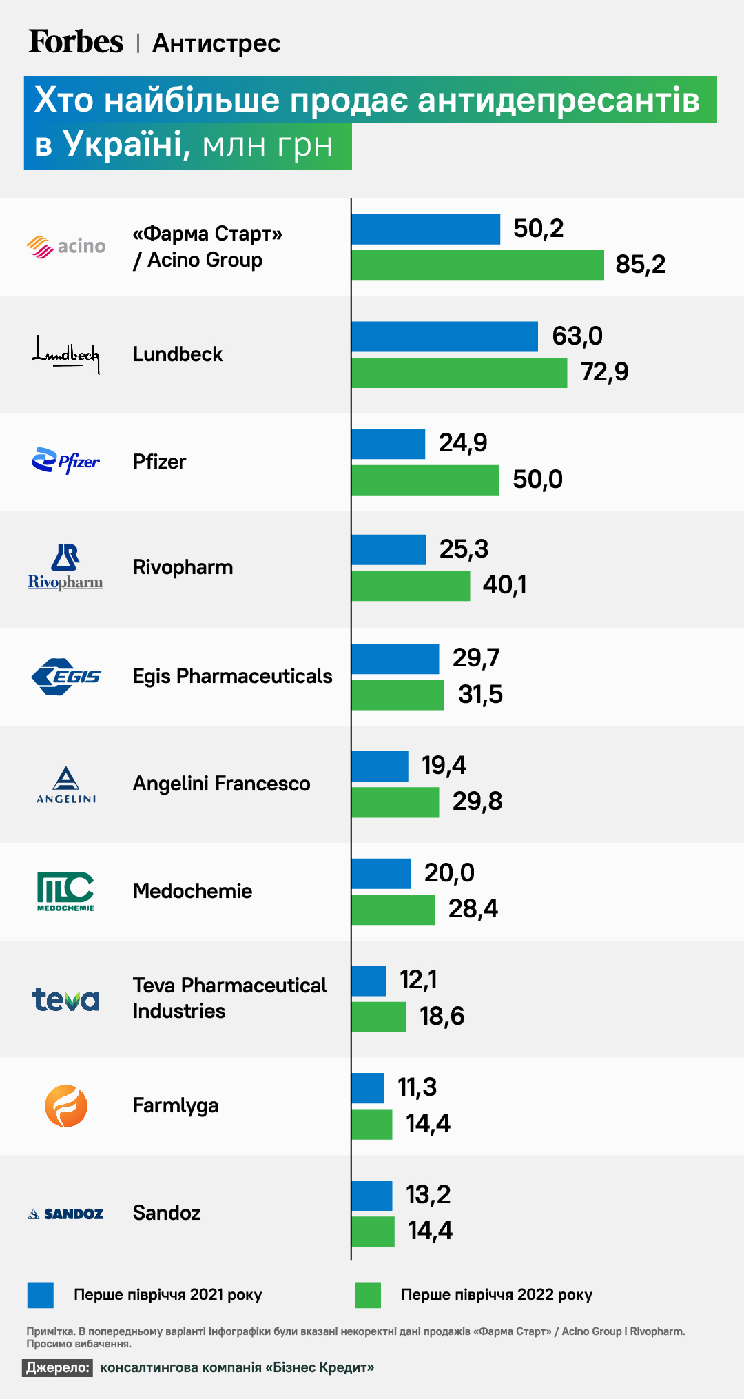 В числе топ-10 фармкомпаний, заработавших на продажах антидепрессантов украинцам больше всего, только одна украинская. 20% от всей суммы продаж данной категории лекарств в Украине, получила "Фарма Старт", входящая в швейцарскую Acino Group. Компания за шесть месяцев 2022 года продала антидепрессантов на 103 миллиона гривен (около 2,5 миллиона долларов США). Далее следуют датская Lundbeck и американская Pfizer.