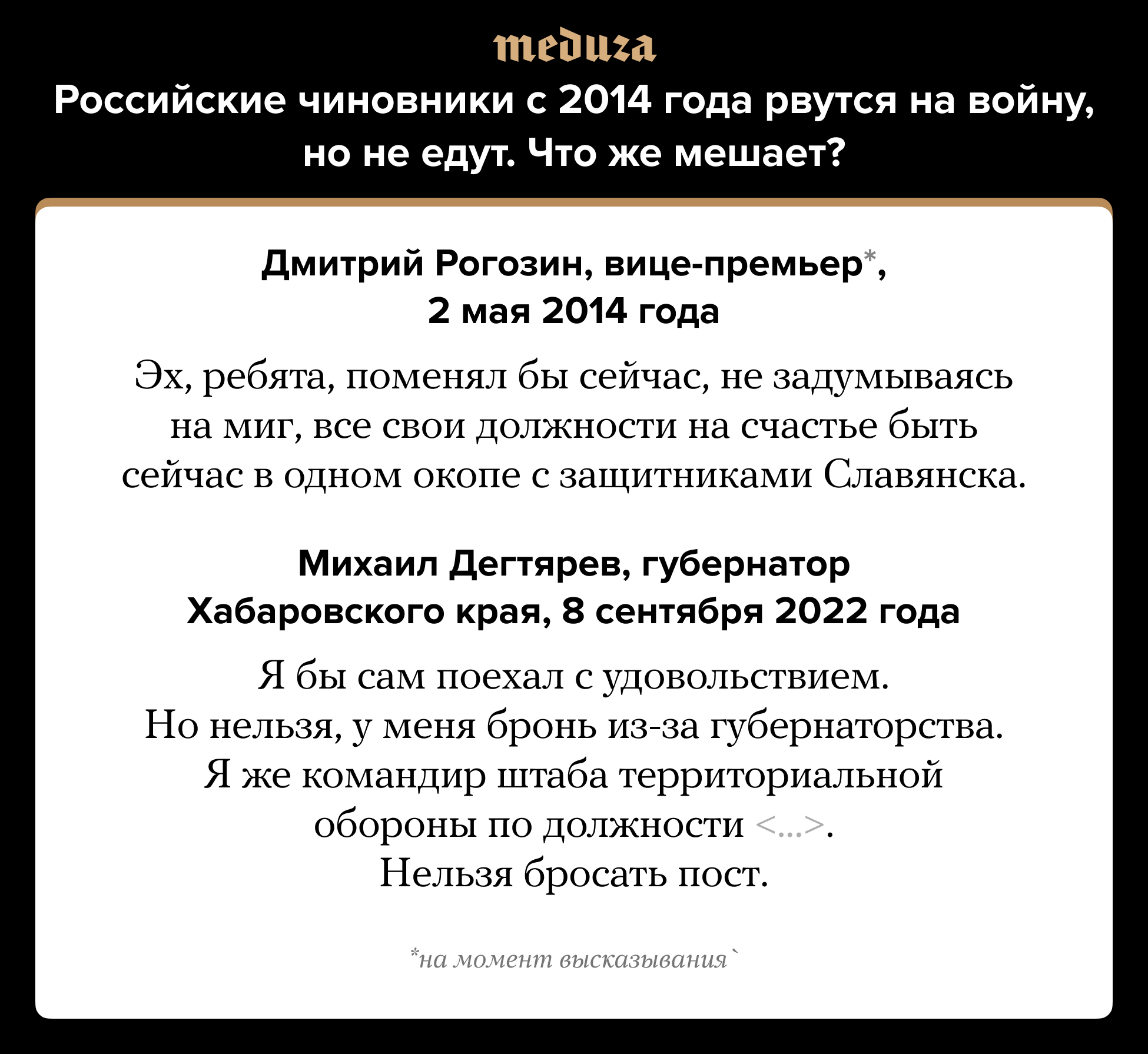 Губернатор Хабаровского края Михаил Дегтярев 8 сентября заявил, что «с удовольствием» поехал бы воевать в Украину, однако ему мешает сделать это его работа на посту главы региона. Российские чиновники не впервые публично заявляют о своем желании лично принять участие в войне, однако в реальности до сих пор никто из них не пытался этого сделать.