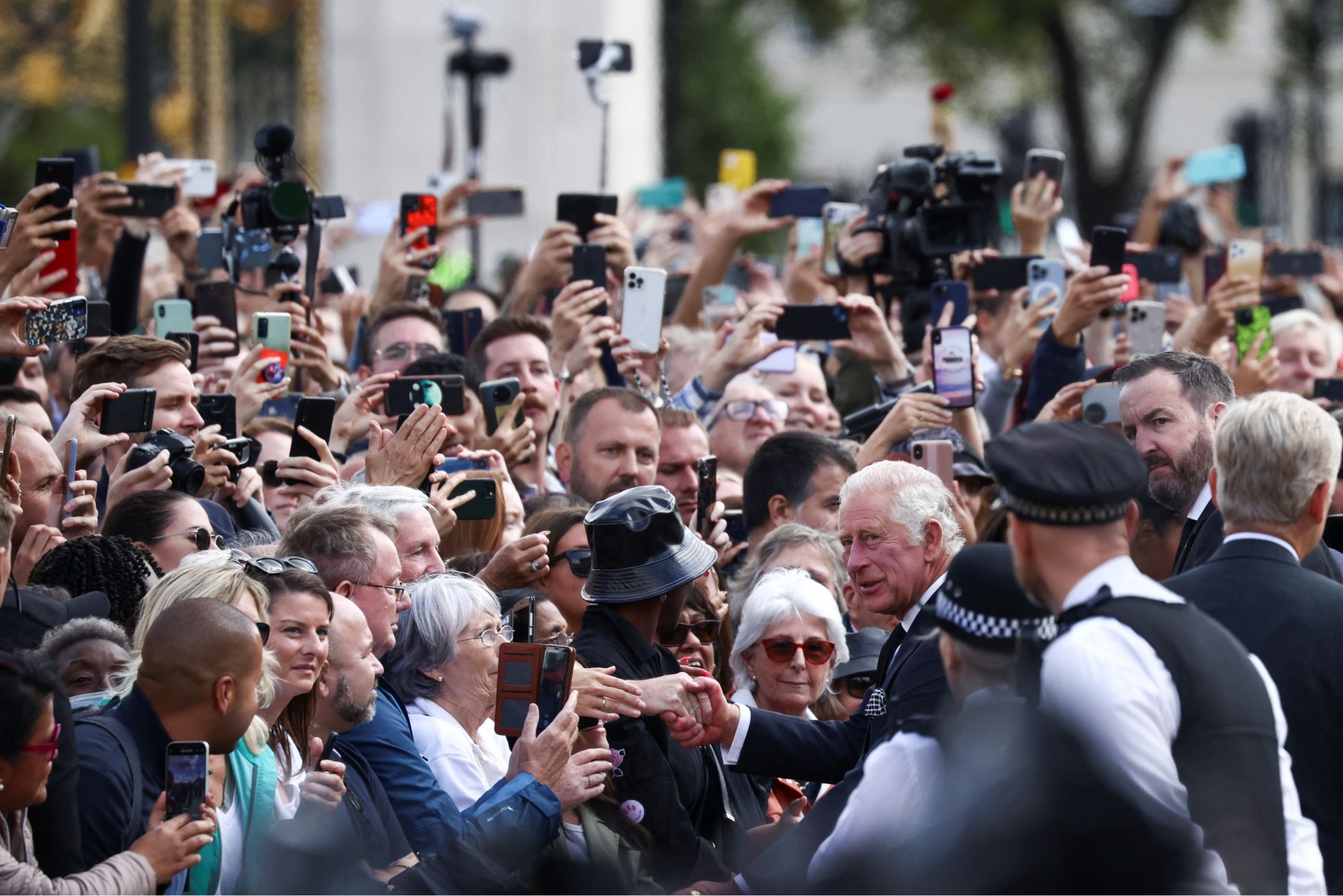 Henry Nicholls / Reuters / Scanpix / LETA Король Великобритании Карл III здоровается с людьми, собравшимися у Букингемского дворца в Лондоне на следующий день после смерти его матери, королевы Елизаветы II. 9 сентября 2022 года