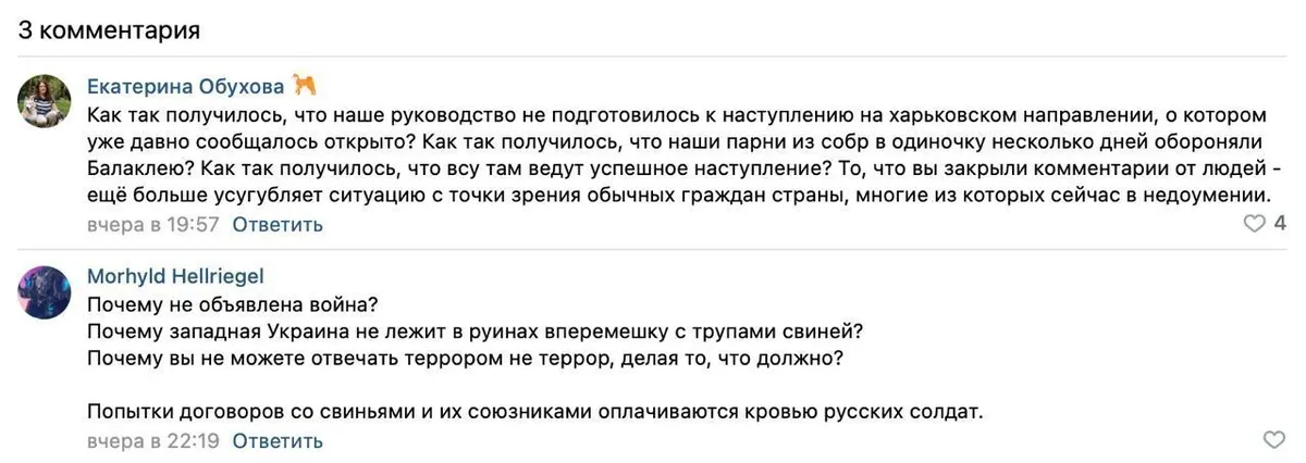 Комментарии были отключены после того, как пользователи стали публиковать критические сообщения по поводу перехода под контроль украинских войск города Балаклея в Харьковской области, отмечает телеграм-канал.