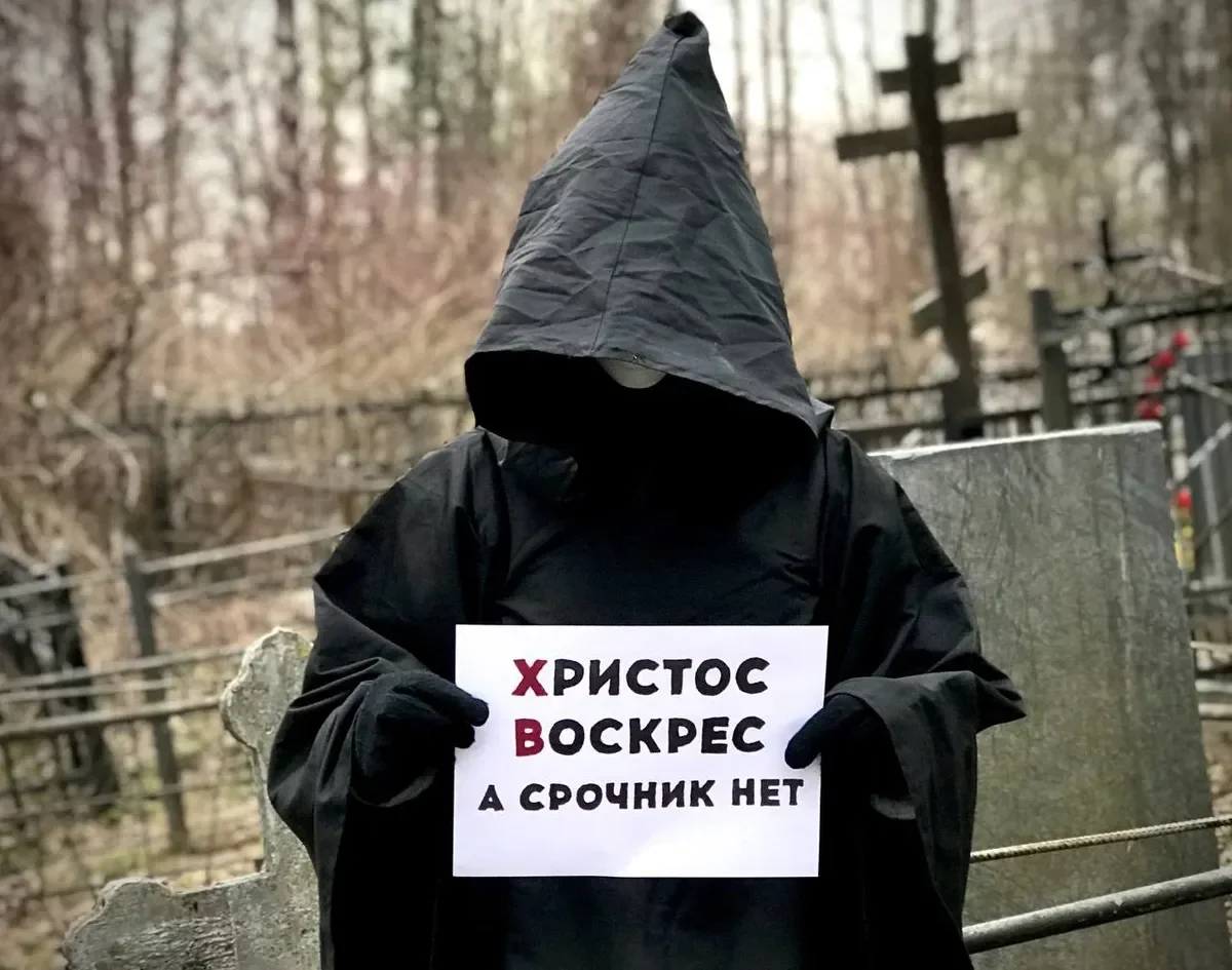 The post that triggered the criminal procedure was published on the last Sunday of April, the Orthodox Easter; it told the group’s followers that an anti-war performance titled Easter at a Russian Cemetery had been held recently. Pictures attached to the post showed an anonymous artist wearing a black robe, its hood covering his face. The artist held posters that read: “Russia will resurrect, and it’s going to be a free country”, “Stop the war, Russia’s soldiers will never resurrect”, “Jesus Christ has resurrected; conscripts never will” and “Stop the war. Civilians will never resurrect.”