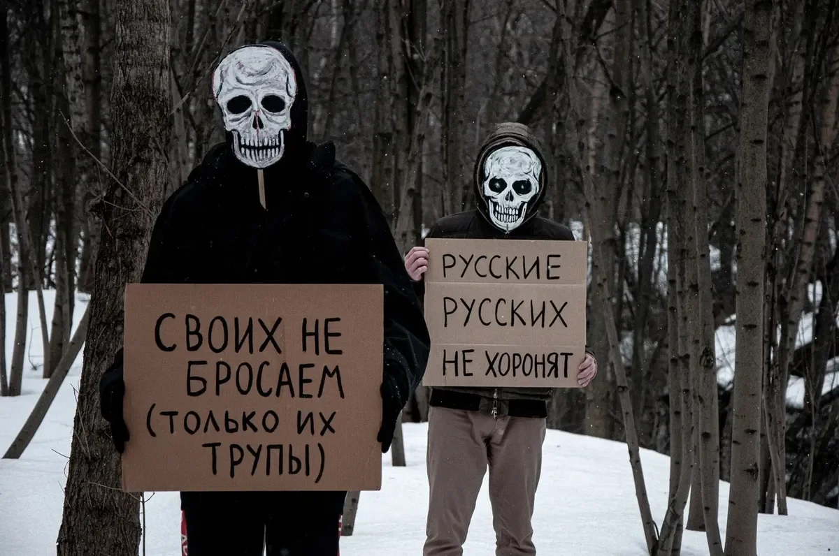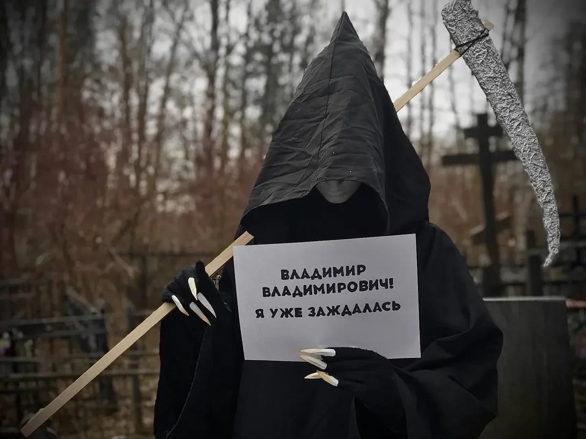 PotD started setting up anti-war performances in March, and they addressed Vladimir Putin in April “from a Russian cemetery, the heart of Russia’s world”, speaking on behalf of the Death. People in dark hooded robes acted as Grim Reapers, holding posters reading: “Vladimir! I’m tired of waiting for you”, “Vladimir! Joseph Kobzon [a nationwide famous pro-Putin singer who passed away in 2018] is holding a concert ticket for you”, “When the living are silent, the dead take the floor”, and “War is Death.”