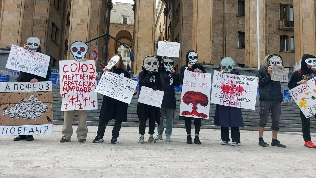 In May, the Saint Petersburg section of PotD set up a performance called The Last Day of May. Activists posed with a poster reading “deathdeathMaydeathdeathdeathdeathdeathdeath”, having their faces covered. “The word Peace is becoming a taboo. War supporters wish this word could be erased, but they don’t call this war ‘a war’ either. <…> The dead wanted to speak, but their voices ‘discredit’ the authorities. In fact, their mere existence ‘discredits’ the authorities. The dead lie against any authorities,” reads a social media publication relating to the performance. There were performances in Georgia’s capital of Tbilisi, too.