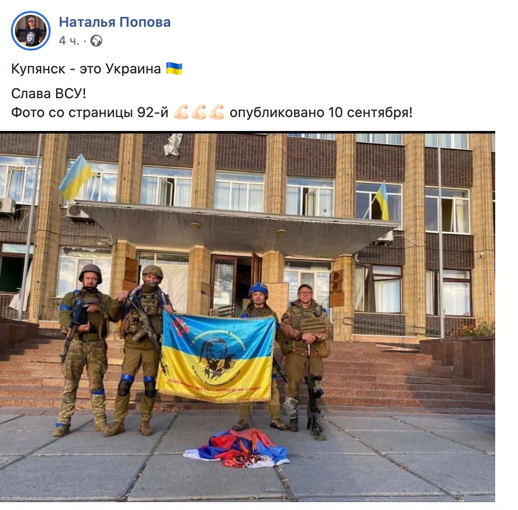Изюм находится примерно в 70 километрах к юго-западу от Купянска, который, как сообщила советница председателя Харьковского областного совета Наталья Попова, освободили Вооруженные силы Украины.