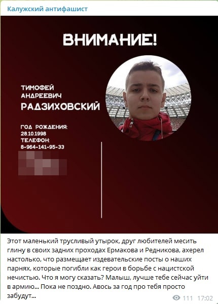 23-летний главный редактор паблика "Гражданское общество Калужской области" из города Обнинска Тимофей Радзиховский недавно получил политическое убежище в Нидерландах. На следующий день после начала войны с Украиной он написал на своей странице в социальной сети "ВКонтакте": “Война – это смерть. Война – деградация. Это самое страшное зло, которое человек творит своими руками. Но ещё страшнее оглядываться вокруг и видеть, как наше общество увязло в государственной пропаганде, будто в болоте. Увязло так глубоко, что уже не подаёт никаких признаков жизни, будто смирилось со своим исходом. На данный момент, исходя из опросов жителей страны, 52% россиян поддерживают вооруженное вторжение на территорию Украины. Путинская пропаганда развернула свои сети не только на взрослое население, теперь школы также зомбируют детей, устраивая им уроки по "русской весне" или же по злободневному освобождению Донбасса. Сейчас существует министерство правды, о чем и писал Оруэлл". Тимофей пытался рассказать председателю Совета безопасности России Дмитрию Медведеву о проблемах Калужской области. Он написал чиновнику комментарии о загрязнении реки Протва и о недоступности медицинской помощи в Обнинске. Но интерес общественности и, видимо, самого Медведева вызвал лишь комментарий с предложением в адрес высокопоставленного чиновника перестать "бухать" и обратить внимание на проблемы региона. Эту реплику обнинский активист сделал в ответ на слова Медведева (Держитесь, тезка! Мы за Вас отомстим!) в группе блогера Goblin (Дмитрий Пучков), чей канал в YouTube заблокировали. Вскоре после этого Тимофею Радзиховскому пришлось бежать из России. Через Ереван и Белград он добрался до Амстердама и сейчас находится в безопасности.