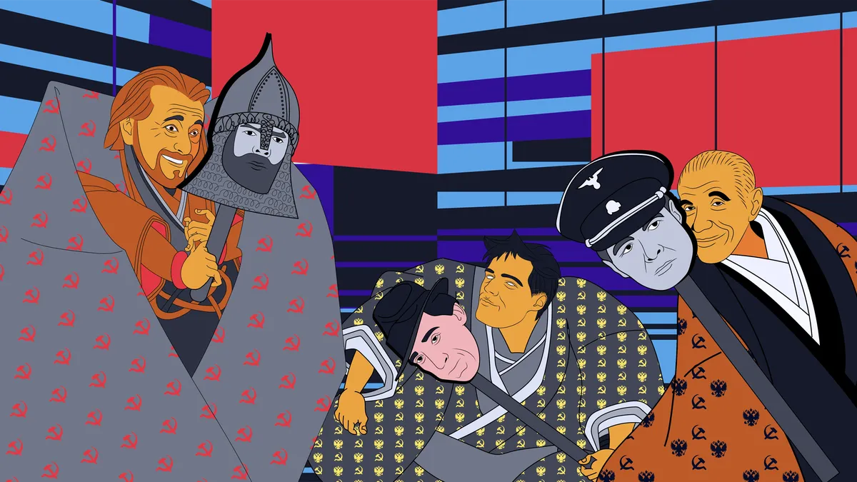 В центр студии спрыгивает откуда-то сверху Глеб Жеглов, исполненный в легендарном сериале Владимиром Высоцким. Жеглов быстрым шагом занимает свое место, пока камера любуется его кожаной курткой, а Невский — Черкасов — Безруков наблюдает явление Жеглова с явным скептицизмом.