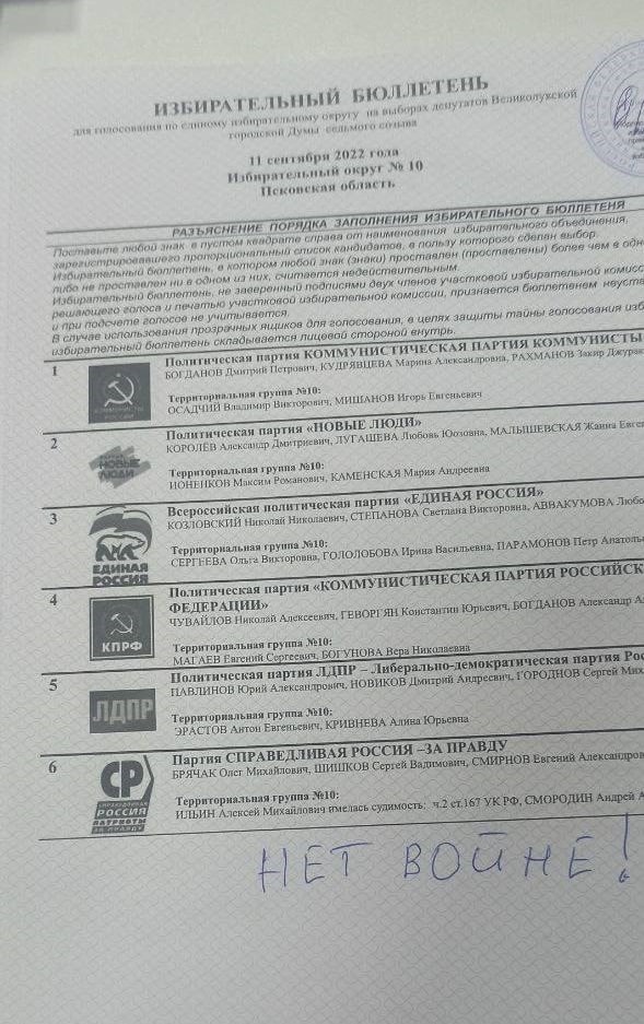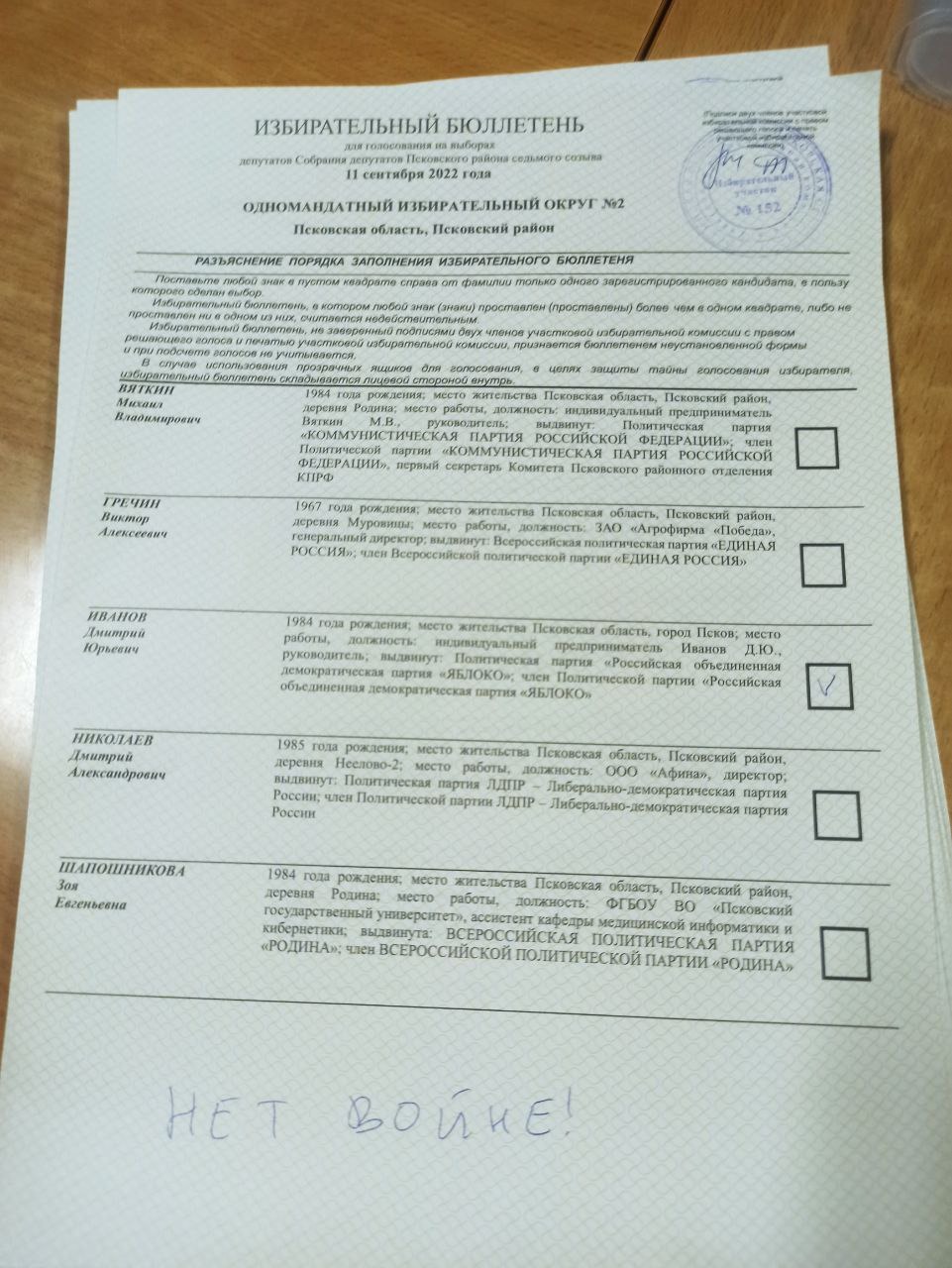 Жители Псковской области писали «Нет войне» на бюллетенях для голосования: фотографии нескольких таких бюллетеней нам прислали наблюдатели.