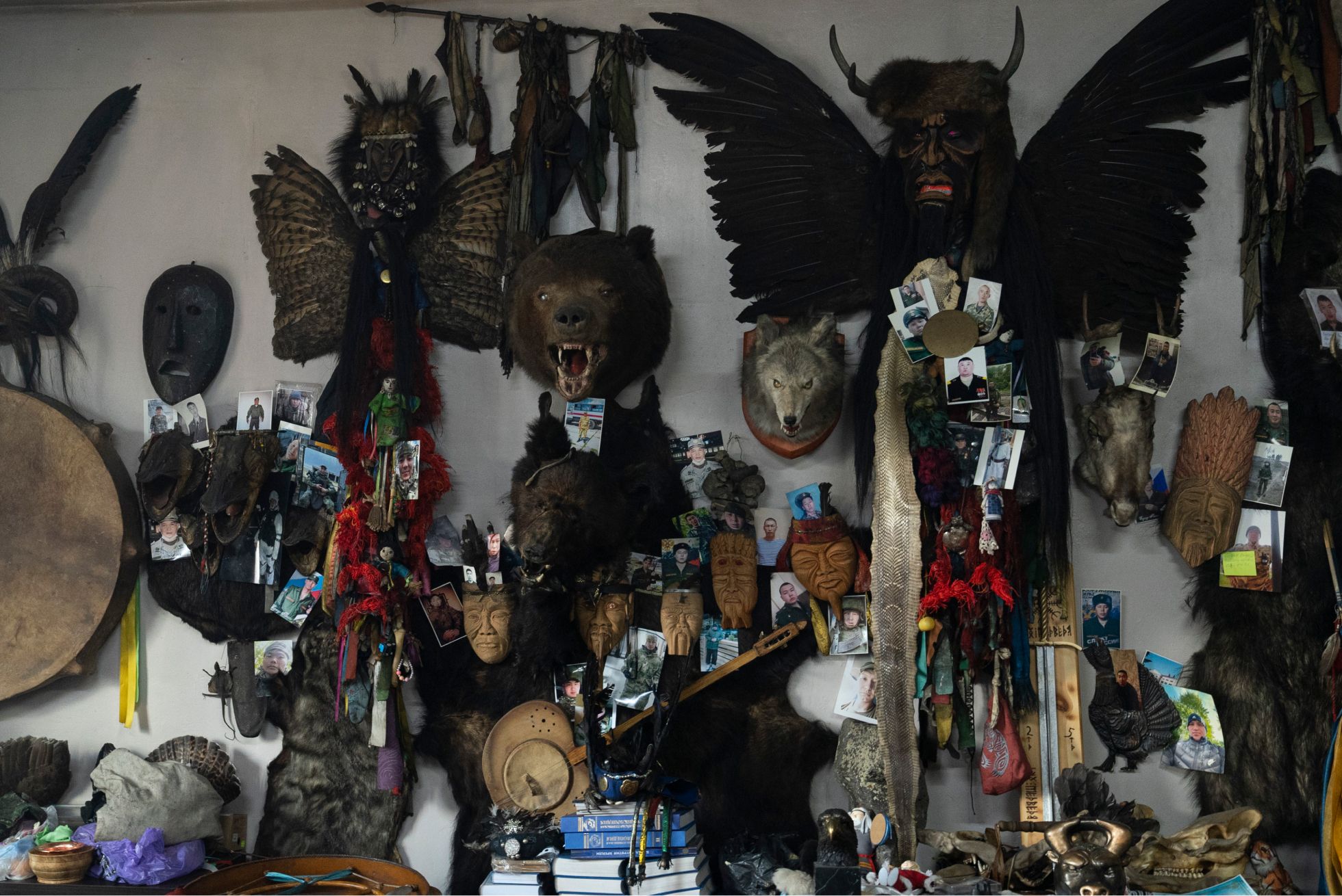 Среди меховых фигур висит множество разнородных предметов: меч, деревянные маски, трехструнная чанзы. Между ними приколоты десятки современных фотографий молодых тувинцев в военной форме. «Ребята с первых дней воюют в Украине, — объясняет верховный шаман „Медузе“. — Некоторые [уже вернулись и] забрали фотографии. Очень сильная защита! Пуля мимо проходит».