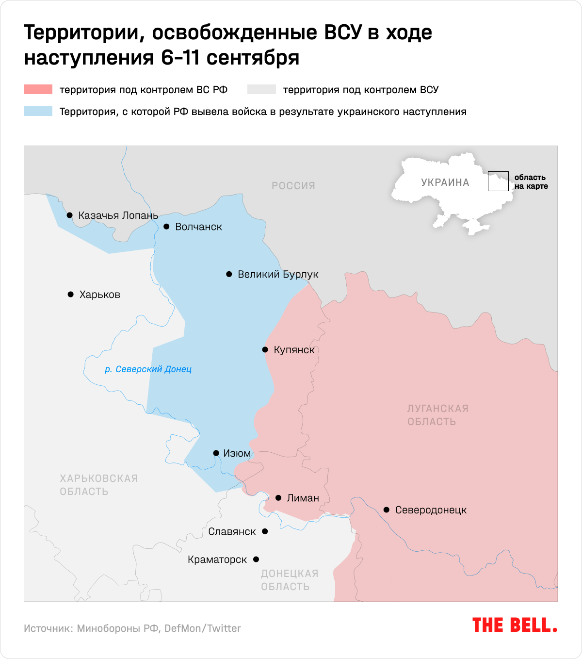 - Ключевые узлы обороны в Харьковской области — Изюм и Купянск — российские войска оставили 10–11 сентября после прорыва под Балаклеей.