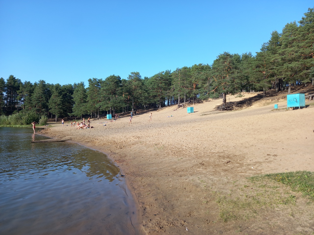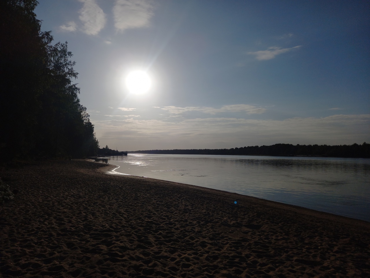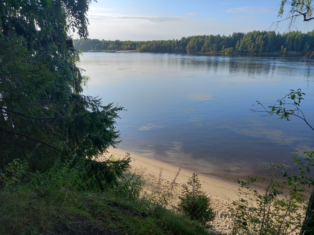 Пляж на реке Свирь. Если на озере купалось много местных жителей, здесь никто не купался. Только несколько человек загорали, наслаждаясь тишиной. Хотя вода здесь чистая на вид и песок приятный.