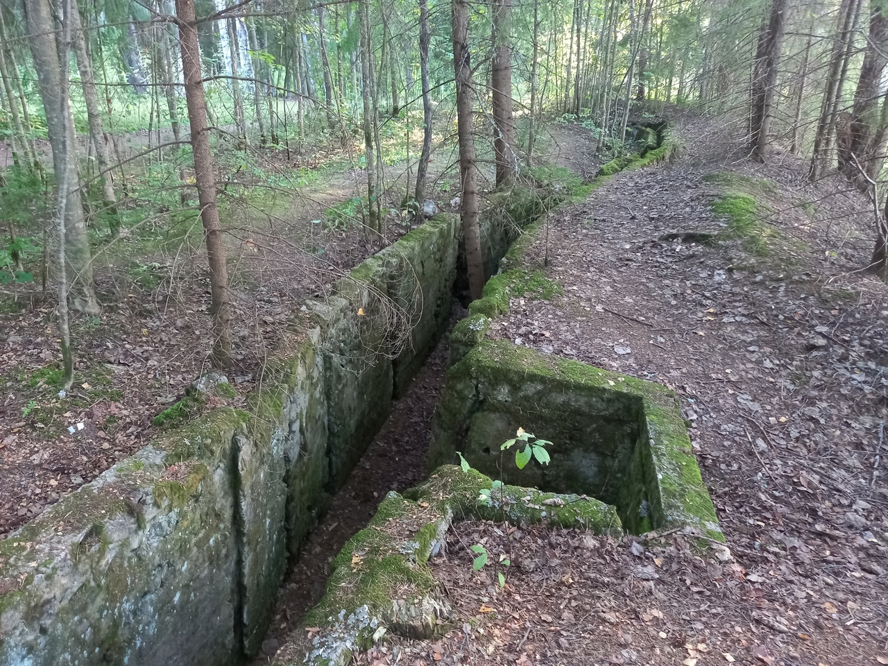 Теперь посмотрим главное, ради чего я шел в этот парк. Это траншеи времен войны. При обустройстве парка их укрепили бетоном. Кое-где можно увидеть невосстановленные участки, там просто окопы в земле, которые со временем частично осыпались. Несмотря на то, что бетон исказил их исторический облик (траншеи укрепляли бревнами), это именно то самое место, где держали оборону советские солдаты.
