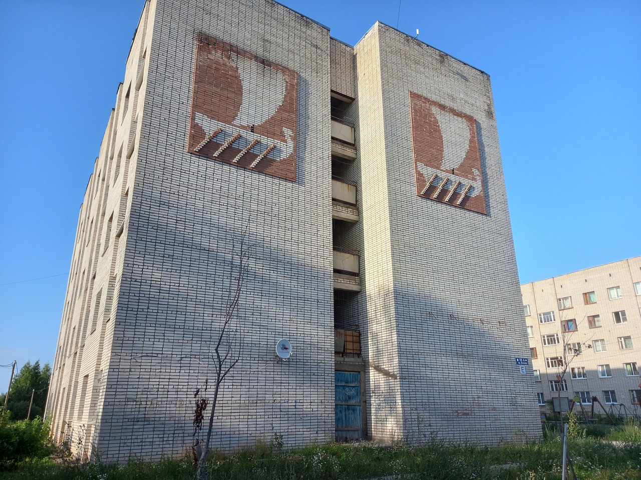 Многоквартирный дом, на котором изображен символ города - ладья. Отсюда и название - Лодейное Поле. Здесь строили корабли, которые потом по реке Свирь попадали в Ладожское озеро, а оттуда — по Неве в Санкт-Петербург.
