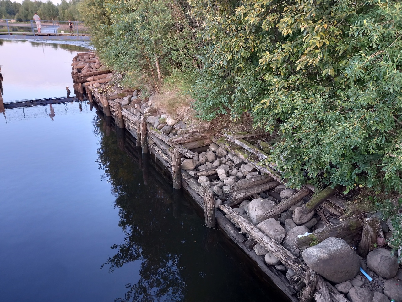 Остатки старого укрепления берега. На эту конструкцию следует обратить особое внимание. Именно по такой технологии строили форты, а в древности - и первые деревянные крепости. Делался сруб из дерева прямоугольной формы. А внутрь засыпали камни, песок, глину. В случае Кронштадтских фортов сверху насыпали земляной вал, чтобы получился искусственный остров. А в случае древнерусских крепостей такая стенка сама по себе была укреплением, за которым можно было спрятаться от стрел врагов.