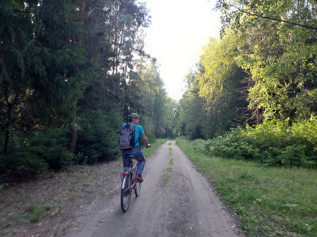 Наш спутник Андрей едет впереди нас на велосипеде. Большая часть парка - это лесная грунтовая дорога. Парк не очень приспособлен для городских прогулок в туфлях и платьях. Это скорее место для погружение в лес, не отходя далеко от дома.