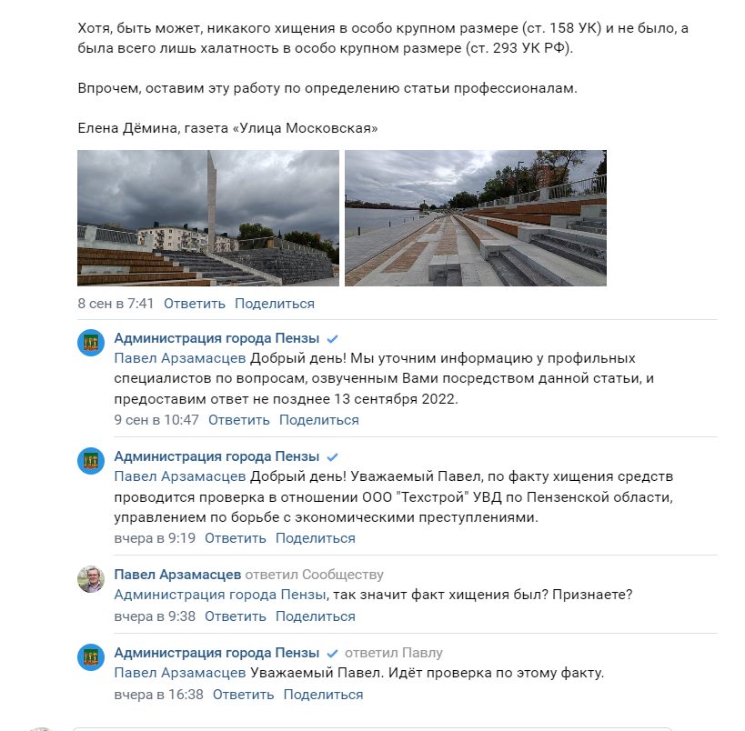 На эту статью из газеты «Улица Московская» размещенную 8 сентября в группе VK Центра управлением регионом (ЦУР) мэрия Пензы пообещала дать ответ до 13 сентября.