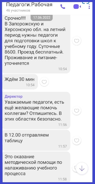 Предложения провести следующий учебный год в подконтрольных России регионах Украины, с оплатой дороги и проживания, начали поступать российским учителям еще летом. Руководители школ скидывали информацию о программе в учительских чатах. Например, педагогам Чувашии предлагалось поработать на оккупированных территориях в Запорожской и Херсонской областях. Сообщалось, что "в этих областях безопасно", а также о хороших суточных – 8600 рублей. Однако директор школы внес это предложение за час до отправки данных в местное министерство образования, а потом сам же отговорил единственного готового поехать учителя, сообщили Север.Реалии в независимом профсоюзе "Альянс учителей".