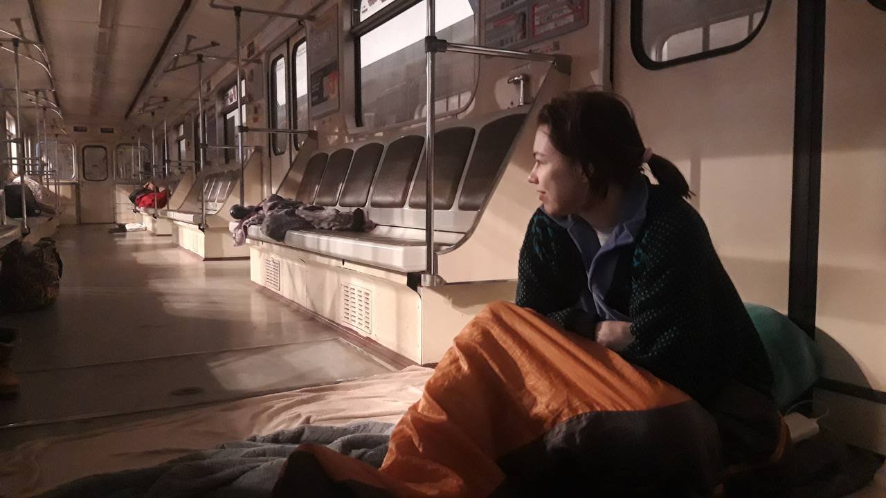 До конца марта, когда была деоккупация Киевской и Черниговской областей, мы с подругой ночевали в метро. Днем выходили помыться, приготовить еду и зарядить телефоны, а вечером до комендантского часа возвращались. Там было много людей. Сначала мы спали, завернувшись в спальники и одеяла, на холодном полу, потом нам подогнали поезд – в вагонах было чуть теплее.