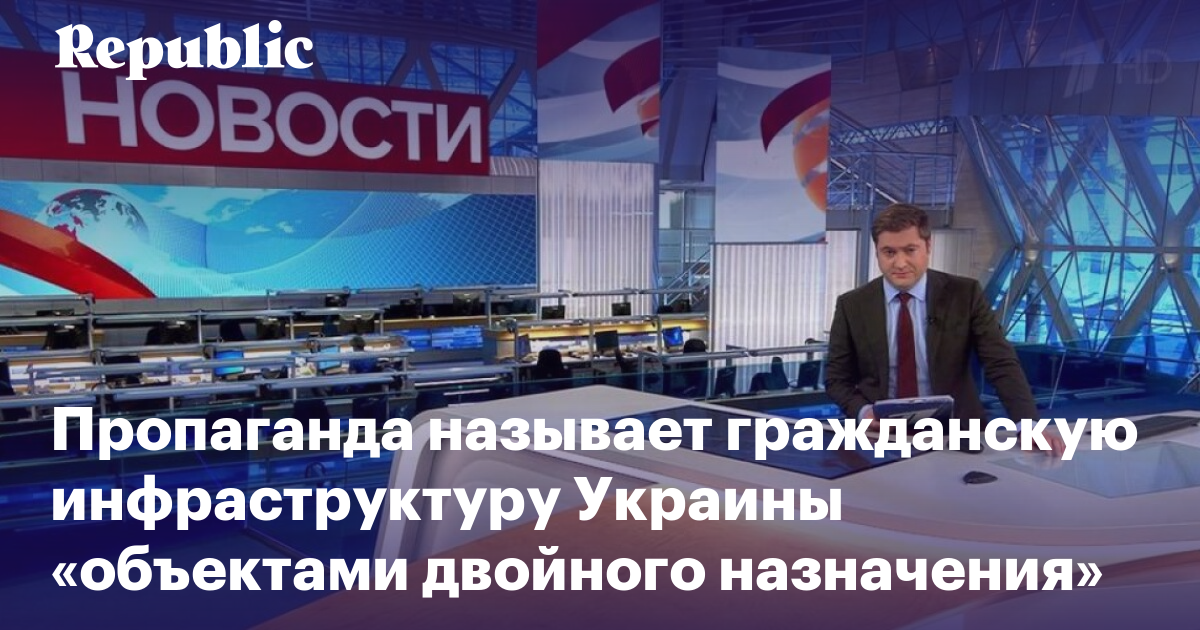 Такую формулировку теперь используют, в частности, в ток-шоу «Время покажет» на «Первом канале» и в новостях на «России 1», передает корреспондент Republic. Каждый раз «объекты двойного назначения» всплывают при обсуждении или освещении военных действий в Украине. Последним поводом стали события 14 сентября, когда ВС РФ ударили ракетами «Кинжал» и «Искандер» по дамбе и другим объектам гидротехнической инфраструктуры Кривого Рога. В результате уровень воды в реке Ингулец поднялся на несколько метров, были подтоплены сотни жилых домов и дачных участков.