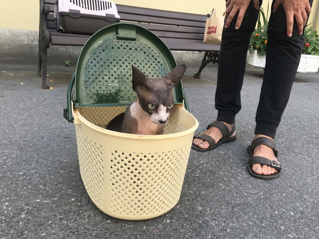 Настя и Виталий топчутся у ветстанции в центре Петербурга. Настя – волонтер, Виталик – сварщик из Мариуполя. Он выехал из разбомбленного города в июле 2022 года наиболее безопасным путем в условиях войны – через границу с Россией. Вместе с ним уехал и лысый кот Макс.