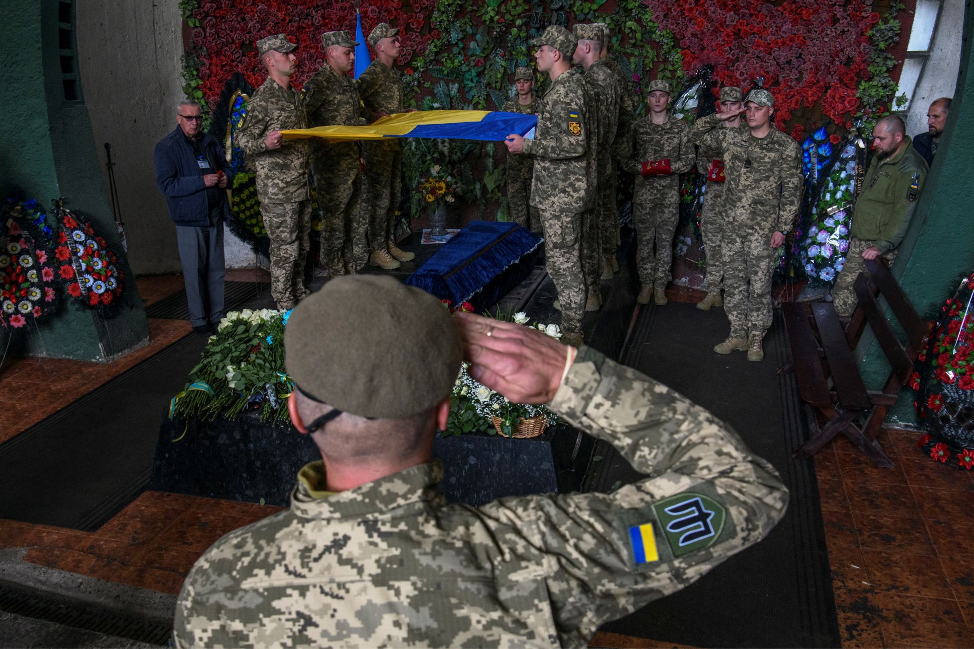 Почетный караул держит украинский флаг над гробом с телом военнослужащей Ольги Симоновой, покинувшей Россию в 2014 году, чтобы воевать на стороне Украины. Недавно она погибла в Донецкой области. Киев, 16 сентября.