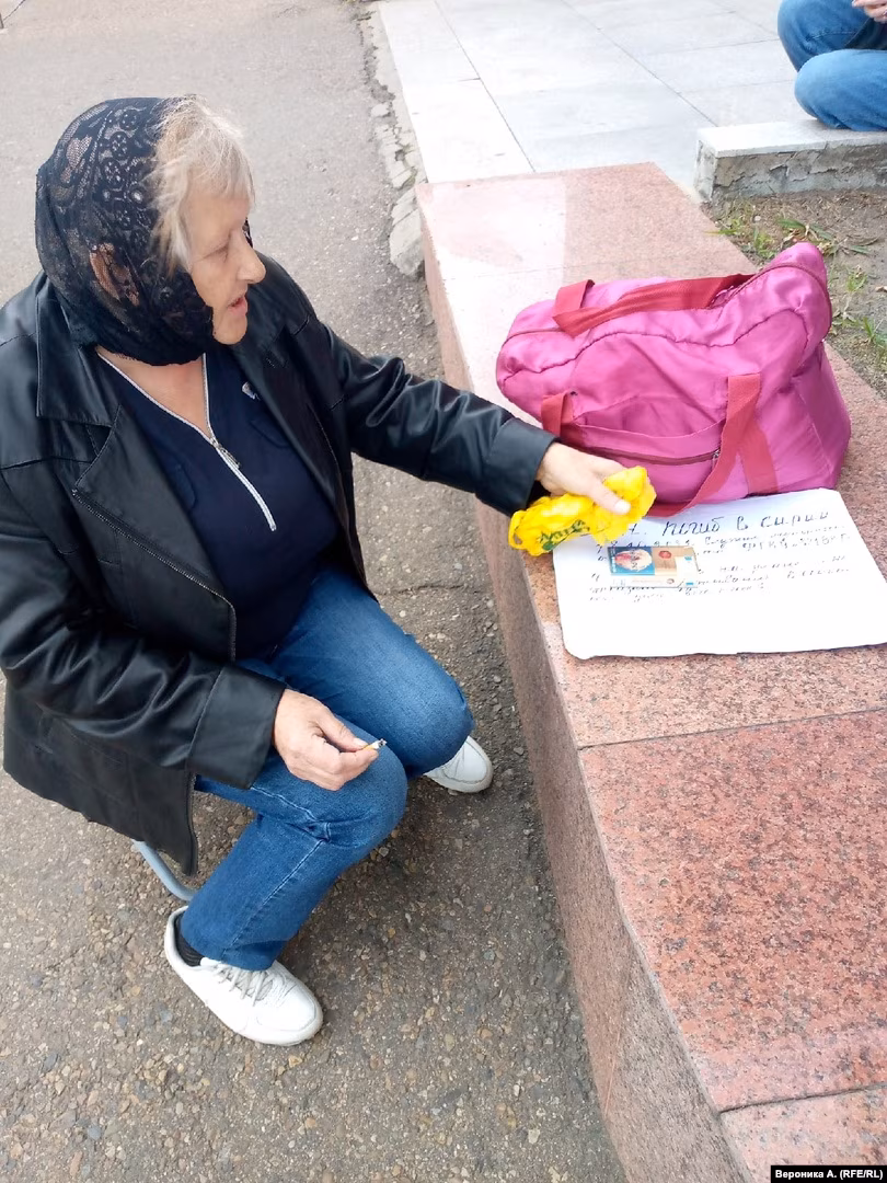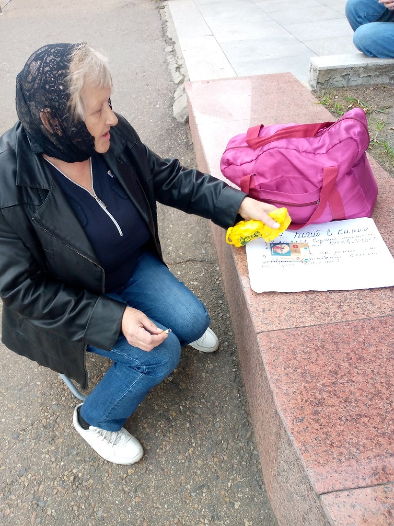 Ирина отправляется обратно к зданию регионального правительства, достает плакат и складной стул из пакета, рассказывает, что последние несколько лет, выйдя на пенсию, жила в Бурятии, где, благодаря сыну, смогла приобрести небольшой неблагоустроенный дом. Ей 60 лет, раньше она работала в военной части в Забайкалье, на гражданской должности. Там с женой и ребенком жил ее сын Руслан. Ирина планировала вернуться к сыну, но не успела, он погиб во время боевых действий в Сирии.