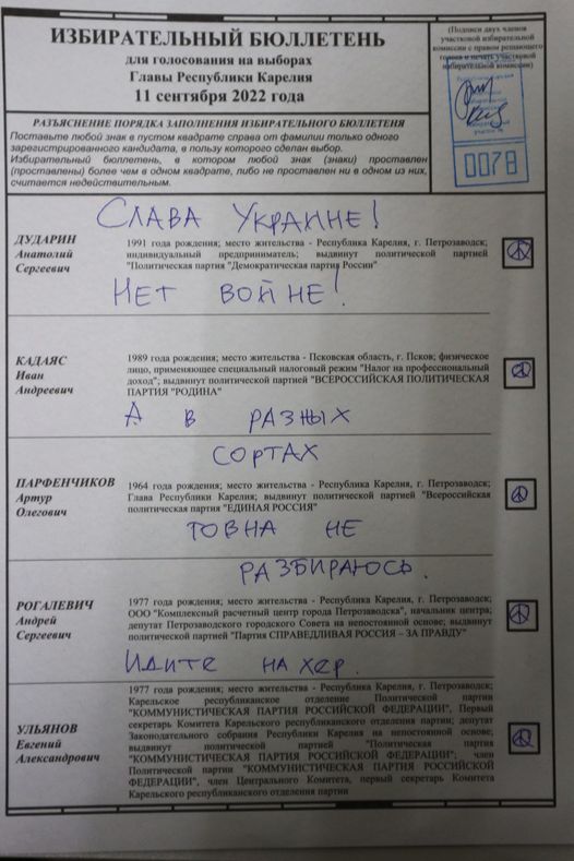 Антивоенный призыв Сергей Филенко оставил и на избирательном бюллетене – в Карелии с 9 по 11 сентября проходили выборы губернатора. На победу, кроме действующего главы региона, единоросса Парфенчикова, претендовали справедливоросс Андрей Рогалев, ездивший на Донбасс коммунист Евгений Ульянов и несколько технических кандидатов. Плотник написал на бюллетене "Слава Украине! Нет войне!", а напротив каждой графы нарисовал пацифик. Фото документа он выложил в соцсетях, как и многие из тех, кто использовал бюллетени для выражения антивоенной позиции.