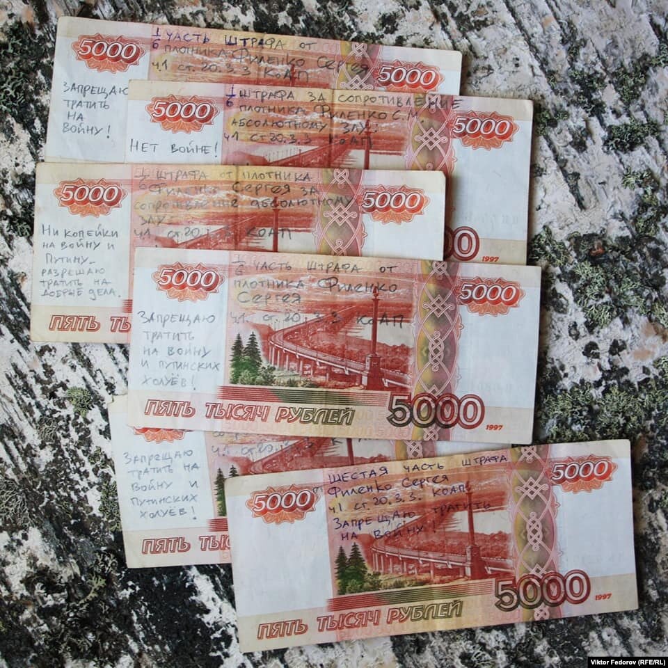"Запрещаю тратить на войну!"; "Ни копейки на войну и Путину – разрешаю тратить на добрые дела" – такие надписи петрозаводский плотник и писатель нанес на шесть пятитысячных купюр, фотографии которых выложил в своем аккаунте в Facebook. На каждой купюре – пояснение: "Шестая часть штрафа плотника Сергея Филенко, ч. 1 ст. 20.3.3 КОАП".