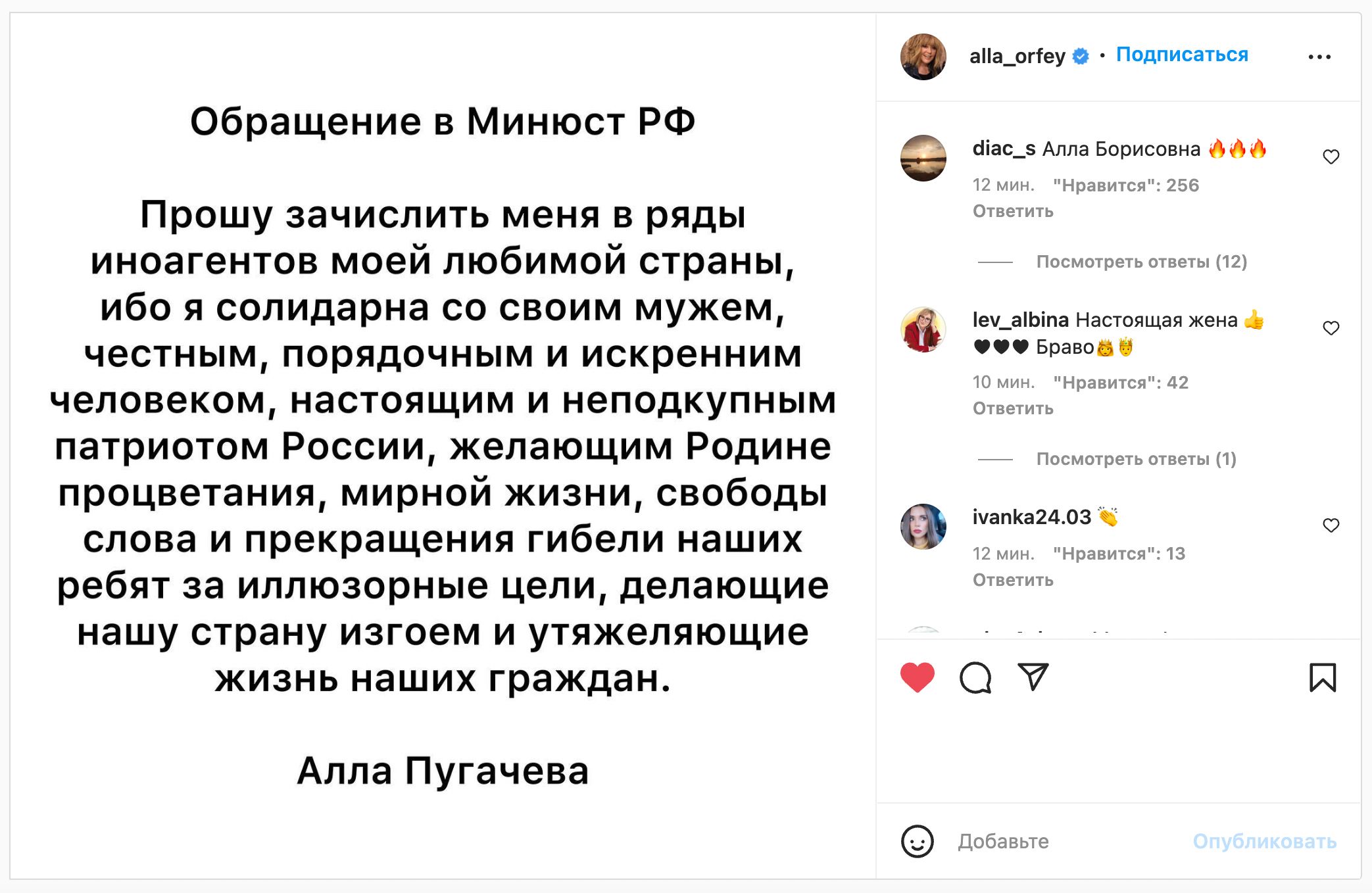 Пугачева заявила, что солидарна со своим мужем Максимом Галкиным — «честным, порядочным и искренним человеком, настоящим и неподкупным патриотом России», который желает своей стране «мирной жизни, свободы слова» и прекращения гибели людей «за иллюзорные цели».