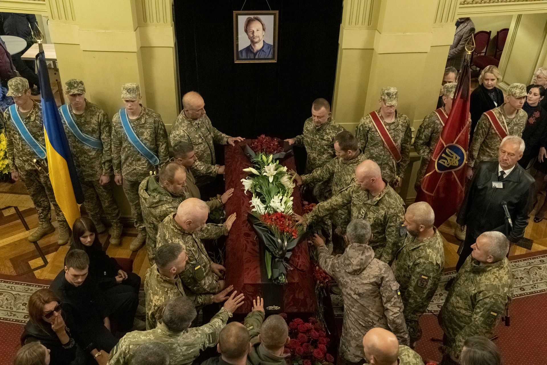 Valentyn Ogirenko / Reuters / Scanpix / LETA Военнослужащие ВСУ на похоронах 47-летнего Александра Шаповала — заслуженного артиста Украины, солиста балета Национальной оперы. Он ушел на фронт добровольцем и погиб в боях под Майорском в Донбассе