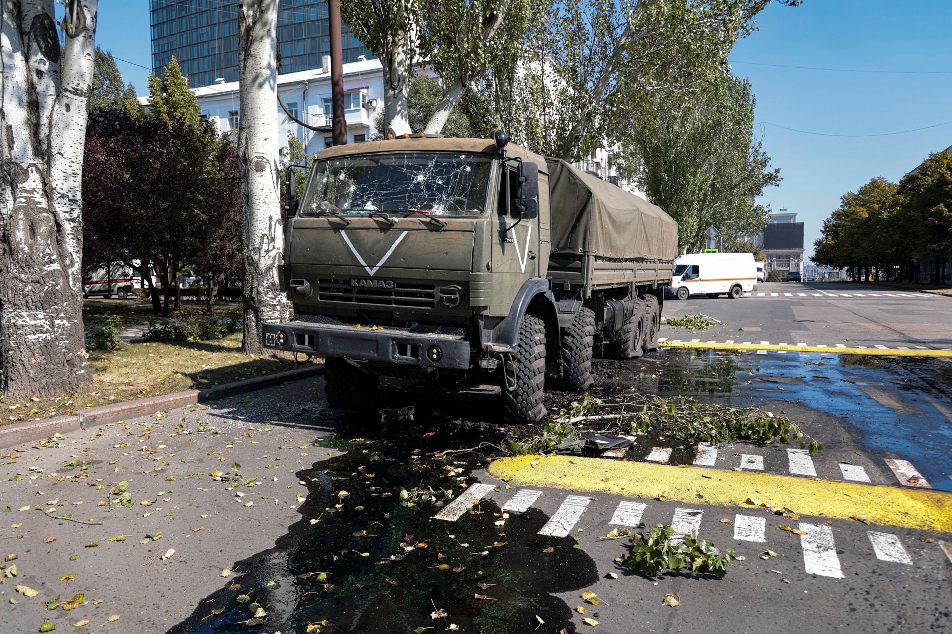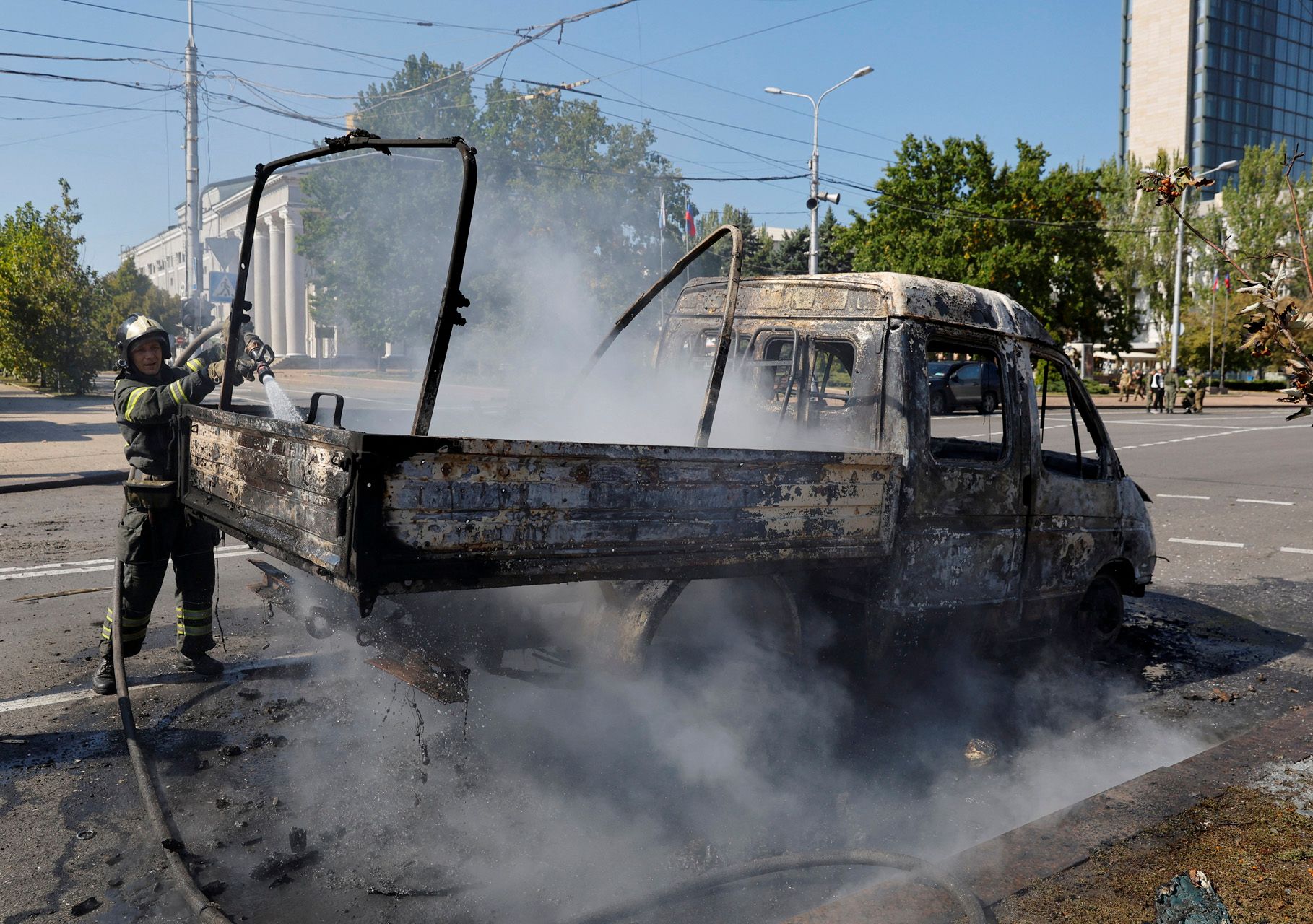 Alexei Alexandrov / AP / Scanpix / LETA Поврежденный в результате обстрела грузовой автомобиль ВС РФ на улицах Донецка. По утверждению властей самопровозглашенной ДНР, на месте обстрела были обнаружены осколки снарядов для французских гаубиц CaesarAlexander Ermochenko / Reuters / Scanpix / LETA Пожарный тушит автомобиль, поврежденный в результате удара по центру ДонецкаAlexander Ermochenko / Reuters / Scanpix / LETA Тело одной из жертв обстрела центра Донецка
