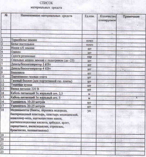 В прилагаемом списке, который получили муниципальные образования Крыма, первым пунктом стоит "термобельё зимнее". Следом идут "бельё постельное", "носки х/б зимние", "одеяло", "сапоги резиновые", "спальные мешки зимние с подогревом (до - 25)", "дизель/бензогенератор (1КВт и 4 КВт)", "бензопила", "портативная газовая плита", "газовый баллон (для портативной газовой плиты)", "тепловая пушка", "вилки питания 220 В", "кабель питающий 3х жильный сеч. 2,5", "кабель питающий 3х жильный сеч. 5", "удлинитель 10-20 метров", "удлинитель 20-25 метров".