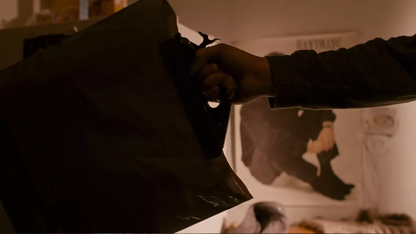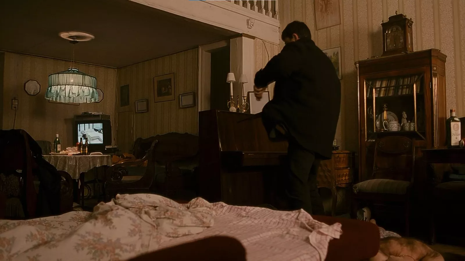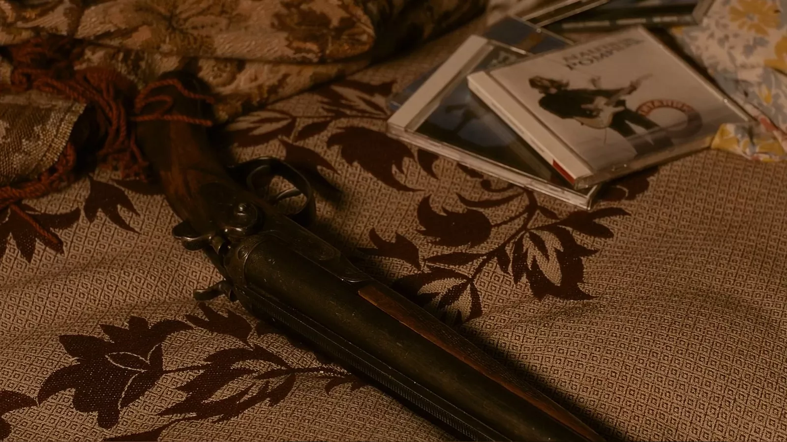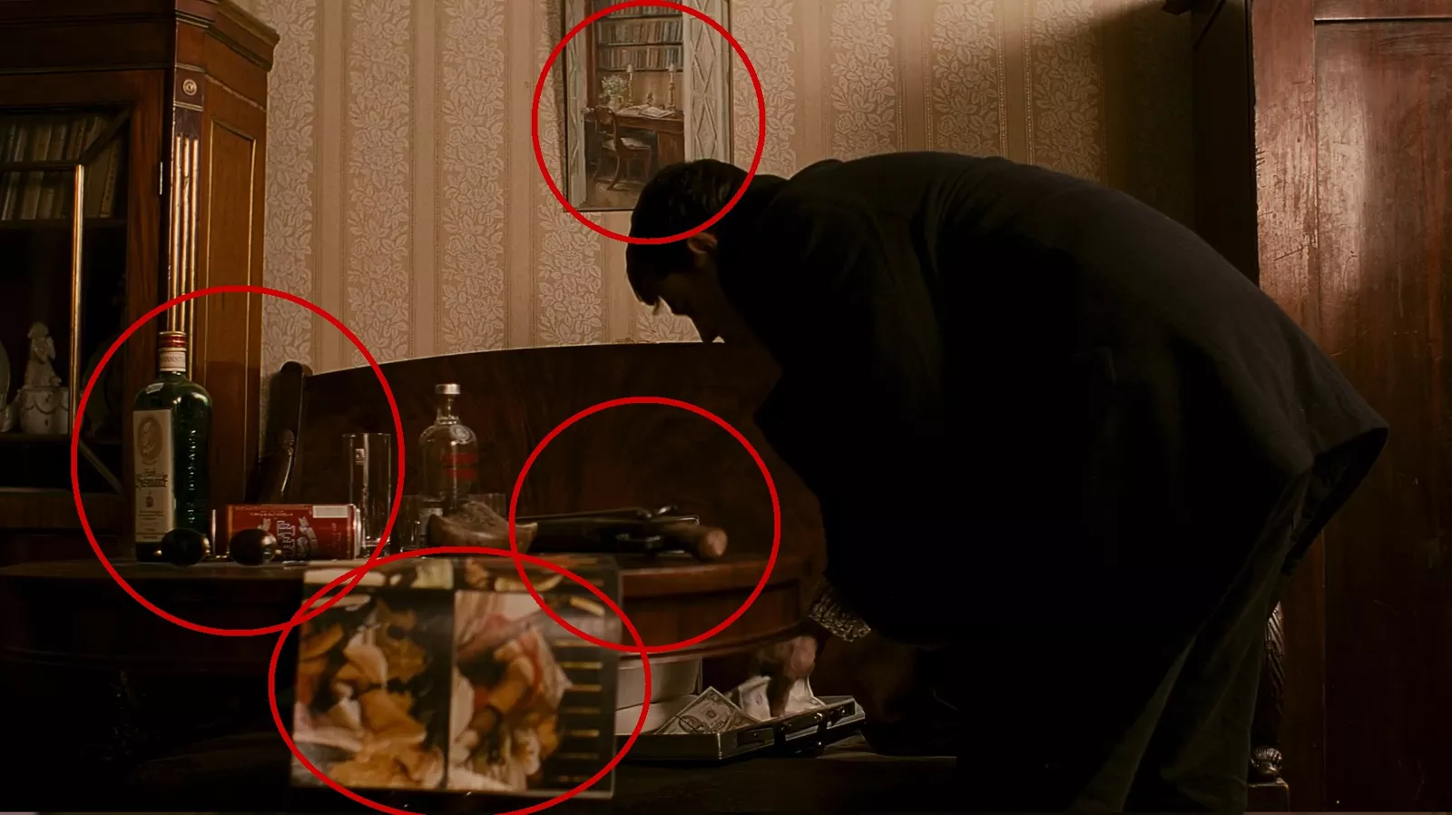 Вот квартира, в которой происходит кульминация. Репродукция на стене, эротический журнал, алкоголь и оружие на столе, богатая мебель, порнография на экране телевизора.