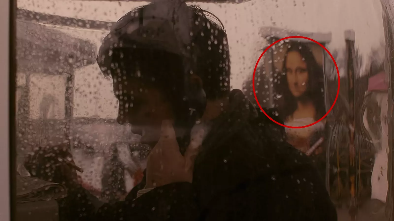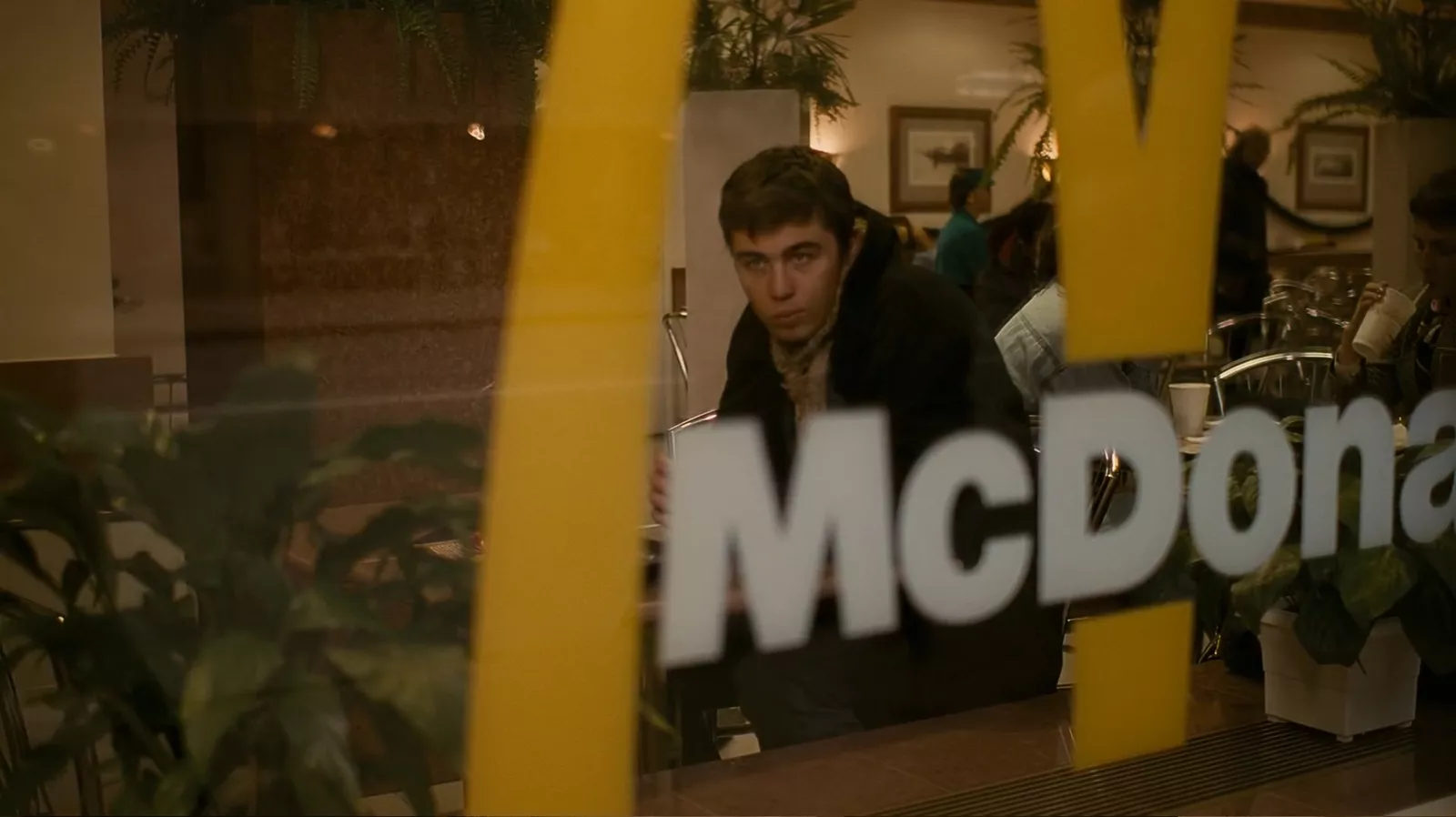 Или вспомним печальную сцену прощания с Кэт. Главный герой остается абсолютно один, понимает, что у него нет друзей и грустит, картинно глядя в окно. Вот только происходит все это в Макдоналдсе на фоне огромной желтой буквы «М». Все это, конечно, приводит к возникновению ощущения, что стилистическая неуместность этой буквы «М» обусловлена просто тем, что в жизни «так и было».
