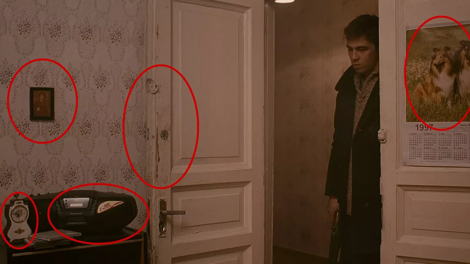 Вот — посмотрите — квартира Светы. Икона, календарь с собаками, часы с претензией, старая дверь и новый магнитофон. Дело, впрочем, не в самой обстановке, а в ситуации, в том, какие события разворачиваются сейчас в этой квартире. Главный герой победил всех врагов, стал богат, и вот он спасает возлюбленную от мужа-агрессора и надеется на то, что она бросит мужа и уедет с ним. Однако Света отказывает Даниле, и он даже не совсем понимает почему.