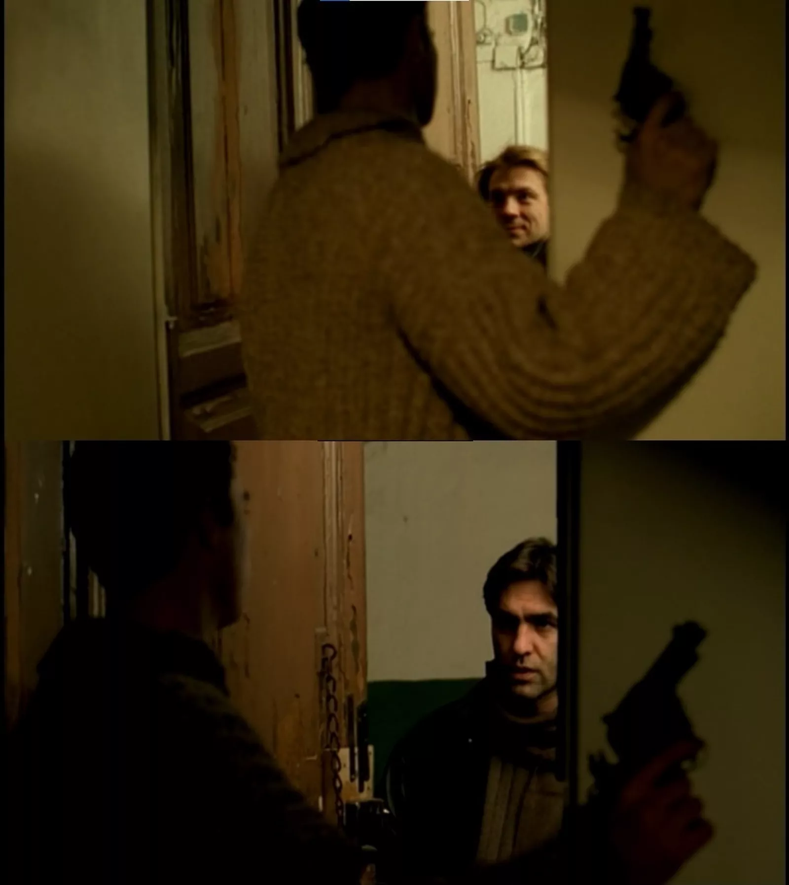 Балабанов также дважды обращается к этому штампу — когда Данила готовится к убийству Чечена и когда он готовится к расстрелу банды Круглого, но если классический аналитический монтаж предельно динамичен, то в «Брате» отдельные кадры слишком длинны.