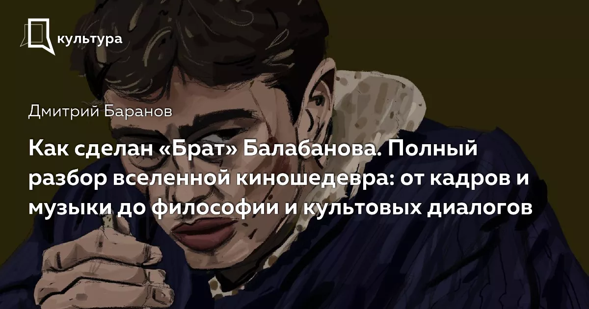 В 20-летнюю годовщину гибели Сергея Бодрова-младшего публикуем покадровый художественный разбор культового «Брата». Почему фильм Балабанова — это по-настоящему высокое искусство, рассказывает специалист по русской литературе и автор научно-популярного канала «Интеллектуальное подполье» Дмитрий Баранов. На какие эстетические и философские традиции ориентируется фильм о 90-х? Что на самом деле означает фраза «не брат ты мне» и как она связана с «Шинелью» Гоголя? В чем гениальность «нейтральной» актерской игры Бодрова? Как организованы переклички между саундтреком и сюжетом? О чем говорят повторяющиеся мизансцены и жесты героев? Зачем и как Балабанов нарушает все жанровые каноны боевиков? Как «Брат-2» высмеивает тех, кто не понял первого фильма? И почему дилогия так полюбилась браткам и пропагандистам?