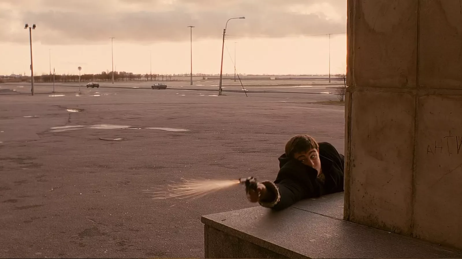 Вот в этом кадре неуместный яркий воздушный шар на фоне болота — это воплощение в визуальном плане того принципа, о котором я только что говорил. Впрочем, дело не только в этом. Я вот упомянул про нарушение в «Брате» каких-то привычных визуальных и повествовательных норм. Дело в том, что одно из популярных представлений о реализме, которое рассматривал Р. О. Якобсон — один из самых заметных филологов XX века, — состоит в том, что реалистичным мы считаем такой текст, который демонстрирует условность предшествующей художественной системы. И вот здесь стоит сказать о том, что в фильме «Брат» мы видим довольно любопытную жанровую игру. И эта игра демонстрирует условность того жанра, который как бы взят Балабановым за основу.
