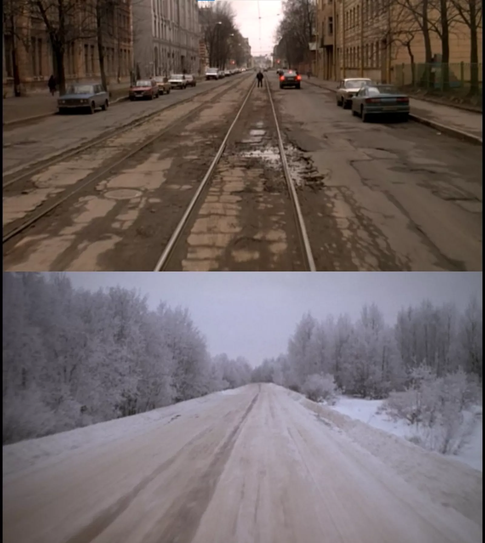 Когда кадр с трамваем появляется в первый раз, он с обеих сторон соседствует с кадрами со Светой. А когда трамвай появляется в следующий (последний) раз, герой прощается с Питером и его обитателями. Естественно, в этот момент трамвай — такой же, как тот, которым управляла Света — напоминает, что логично, именно о Свете, которую герой оставляет.