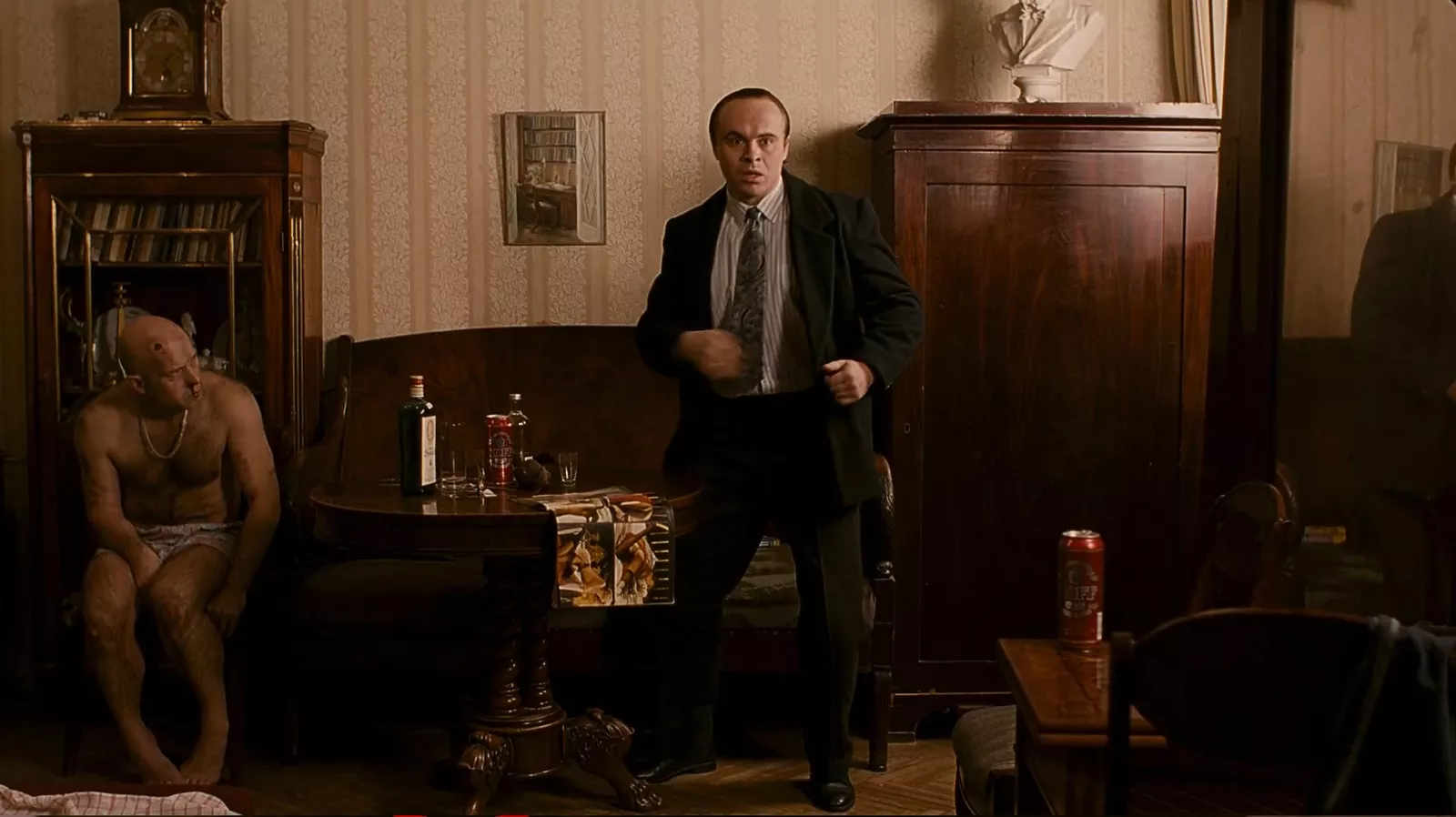 Тема страха важна не только в связи с тем, что герой боевика традиционно бесстрашен. Данила Багров — тот, кого боятся, и не только бандиты. В начале фильма герой сидит рядом с избитым им охранником. Они ведут неловкий диалог, охранник отвечает с неохотой. Схожую ситуацию мы видим во время разговора Багрова с режиссером Степой, который случайно чуть не стал жертвой бандитов во главе с Багровым. Данила снова слева, его собеседник — справа; Степа отвечает на вопросы односложно. Две сцены перекликаются и за счет одного и того же жеста — Багров пальцем правой руки дотрагивается до губы.