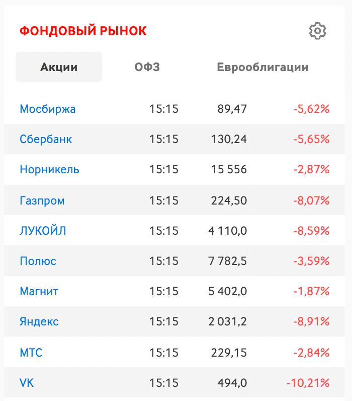 Котировки ценных бумаг на Московской бирже резко пошли вниз после сообщений о проведении «референдумов» в самопровозглашенных ЛНР и ДНР и решении Госдумы добавить в Уголовный кодекс РФ понятия «мобилизация» и «военное положение».