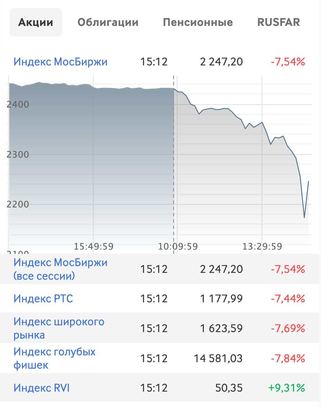 К 15:12 мск индекс Мосбиржи снизился на 7,54% до 2247,2 пункта, индекс РТС упал на 7,44% до 1177,99 пункта. К 15:20 мск часть потерь индексы отыграли, но оставались на минимальных уровнях за последние недели.